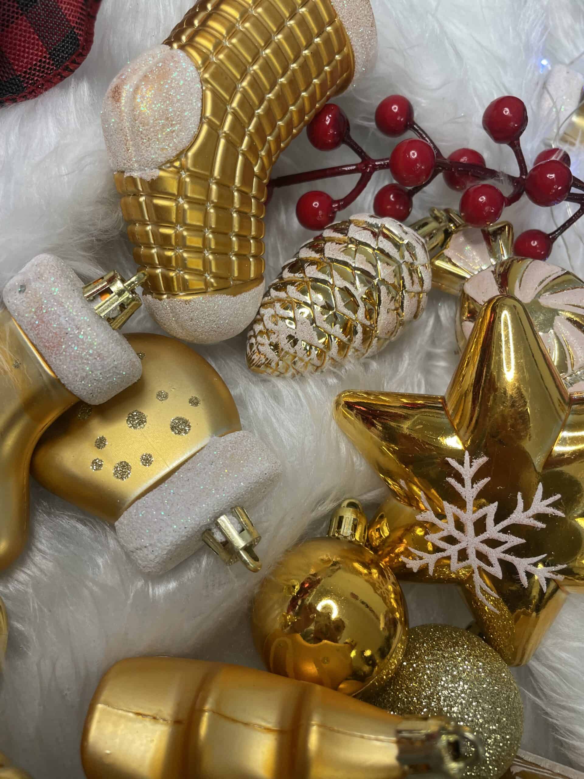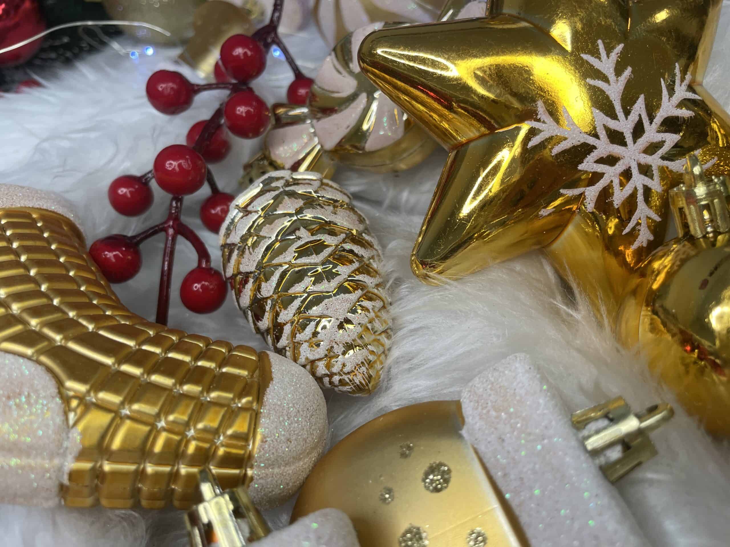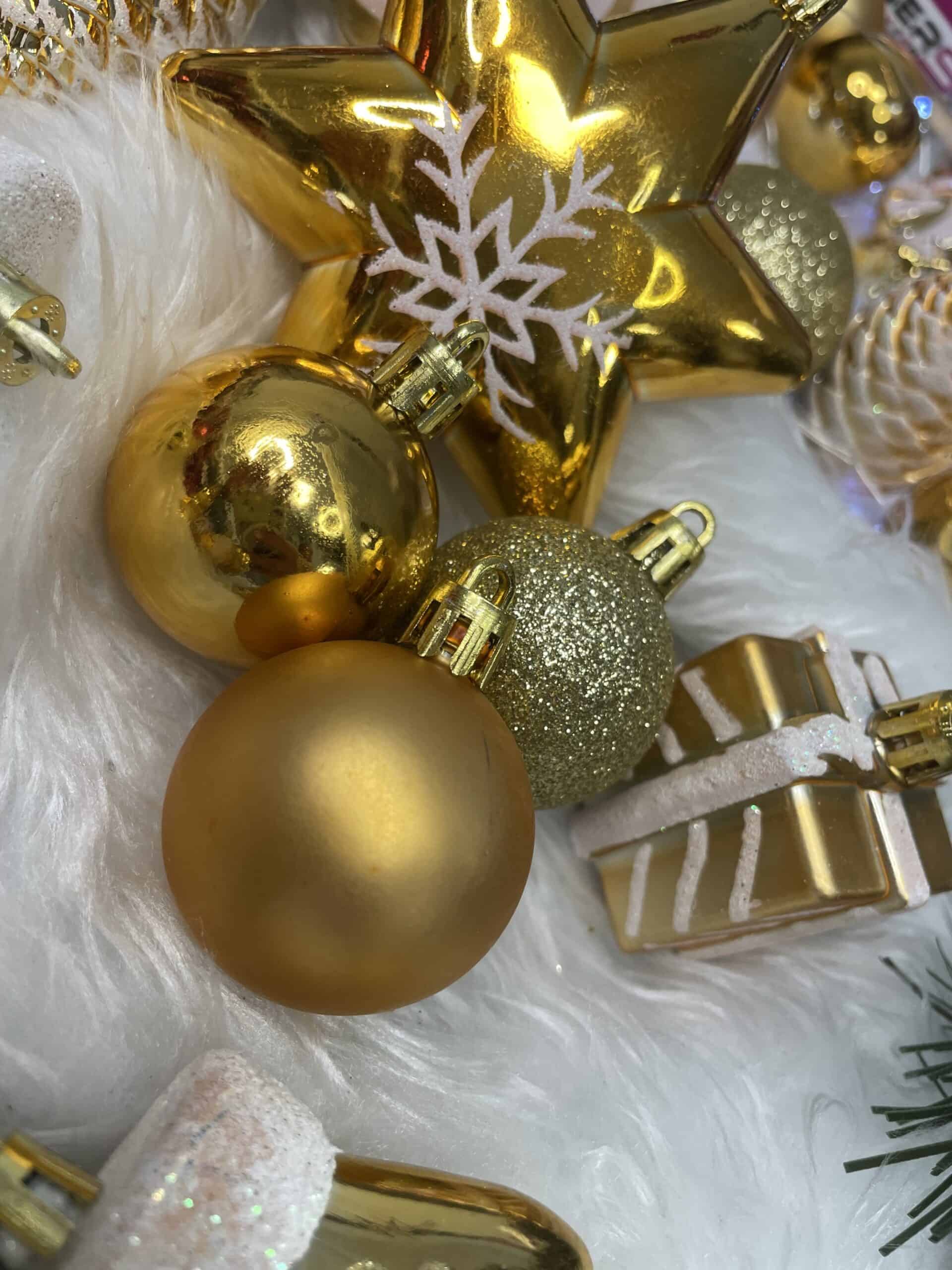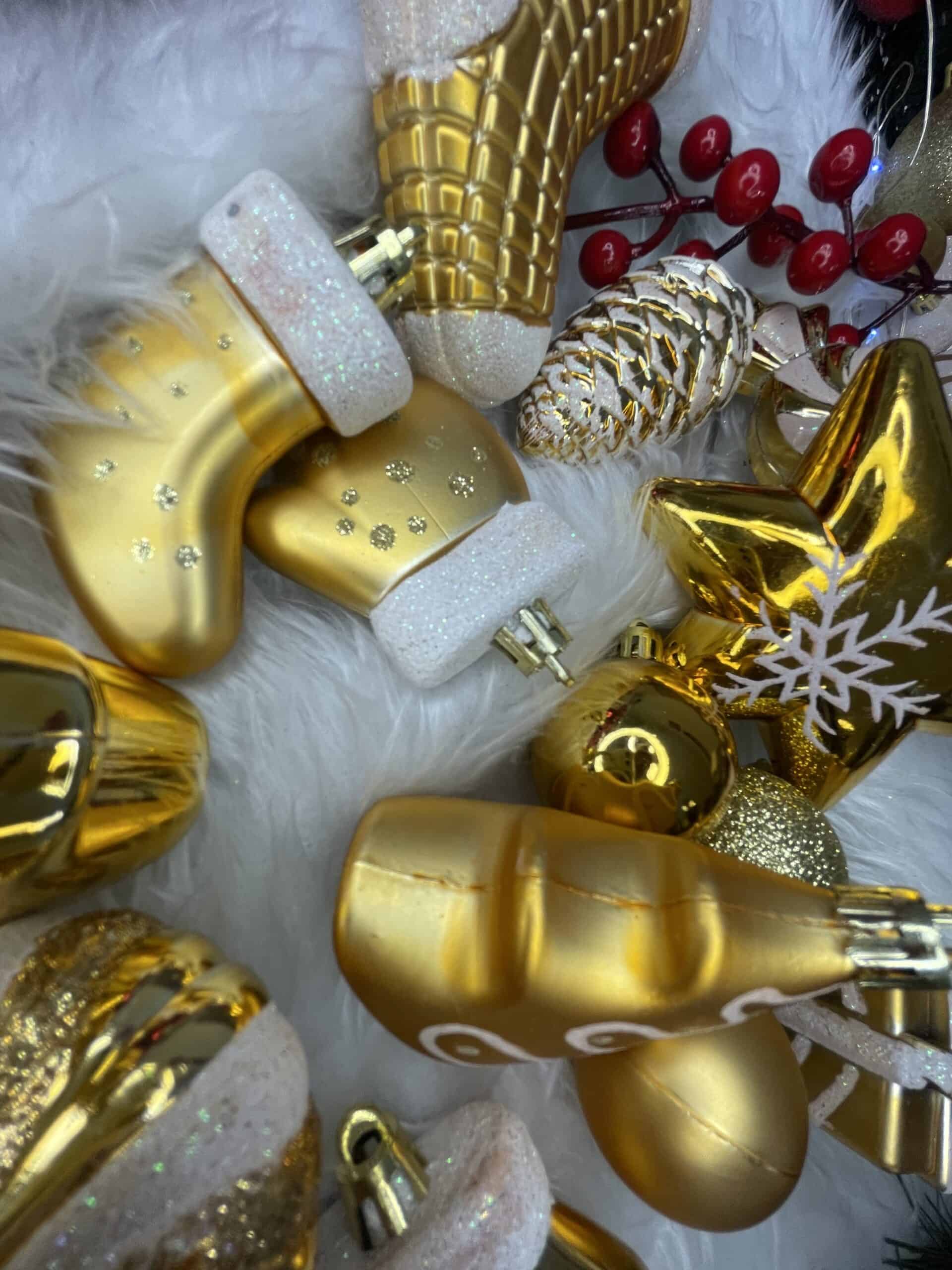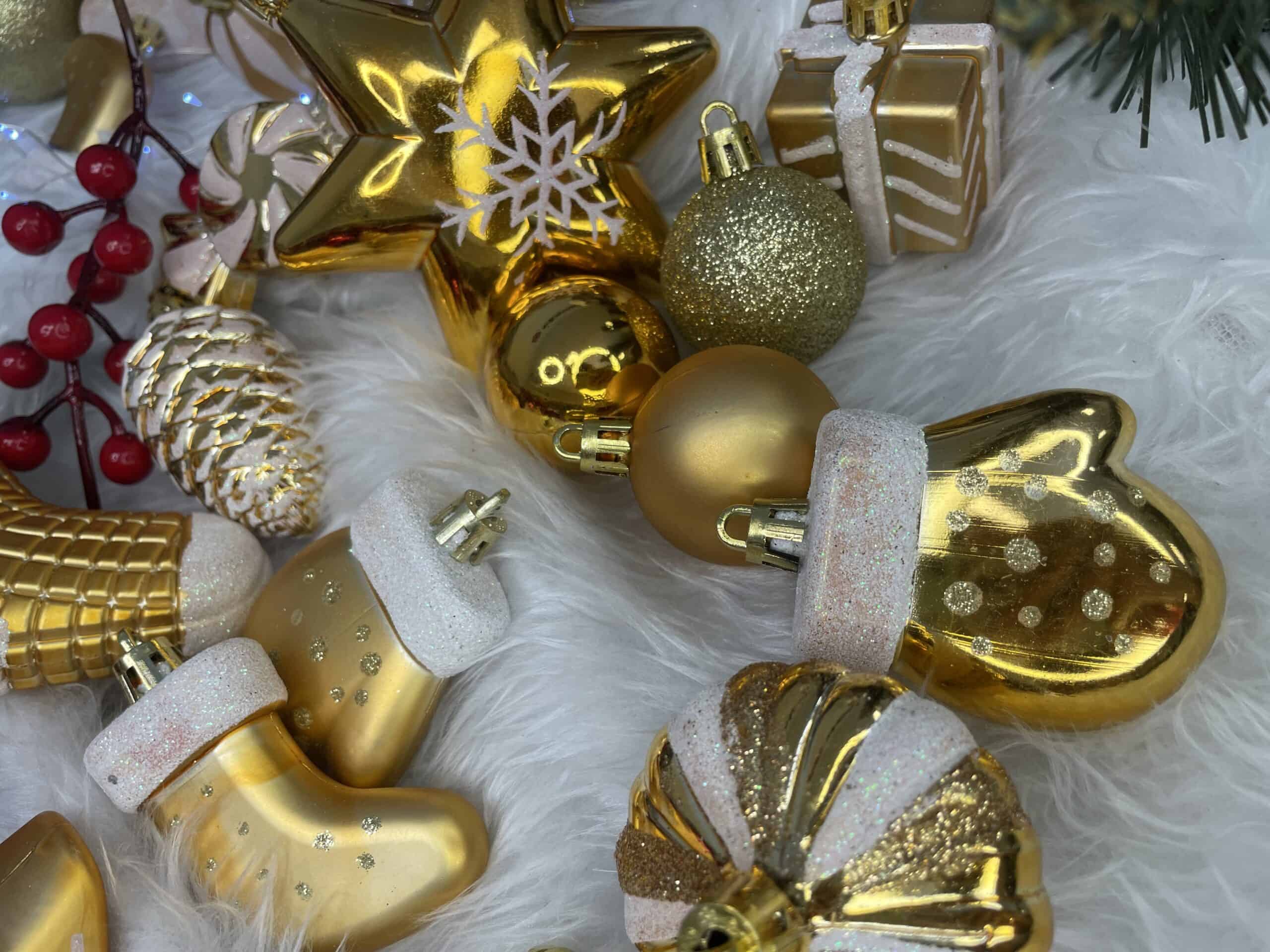 Set globuri si decoratiuni de Craciun, 77 piese, diverse dimensiuni, auriu Mob360