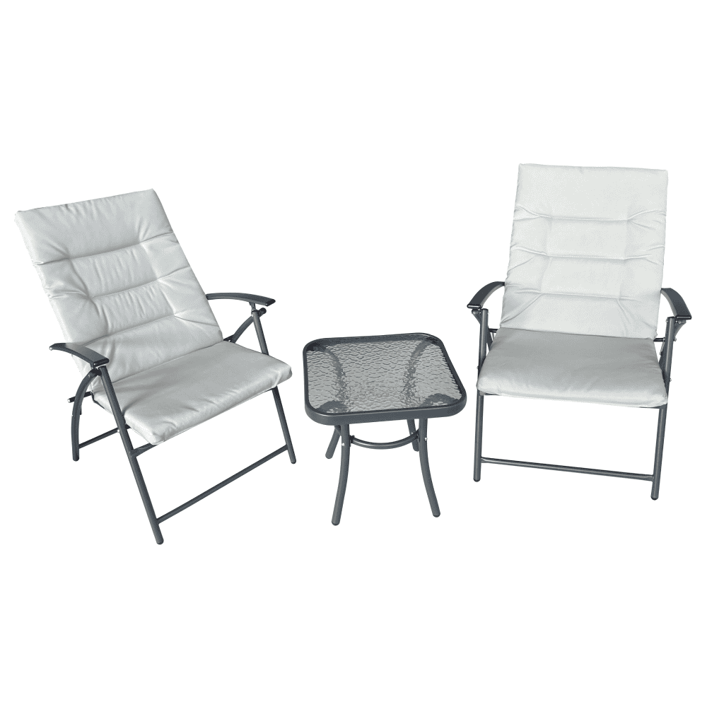 Material: ţesătură / metal Culoare: gri deschis / gri închis Rezistenţa ţesăturii conform testului Martindale: 95.000 de cicluri de frecare Masă (LxAxÎ) 45x45x45 cm Scaun (LxAxÎ): 60x63x83/91 cm Înălţime scaun: 43 cm Adâncime scaun: 42 cm Lăţime scaun: 50 cm Înălţime spătar: 60 cm Lăţime spătar: 49 cm Capacitate de susţinere a scaunului: 90 kg Capacitatea de încărcare a mesei: 15 kg Cu perne Huse nedetaşabile Impermeabile Grosimea pernei: 3 cm Set de 3 piese 1 x masă 2 x scaune Scaune livrate asamblate Masă livrată dezasamblată