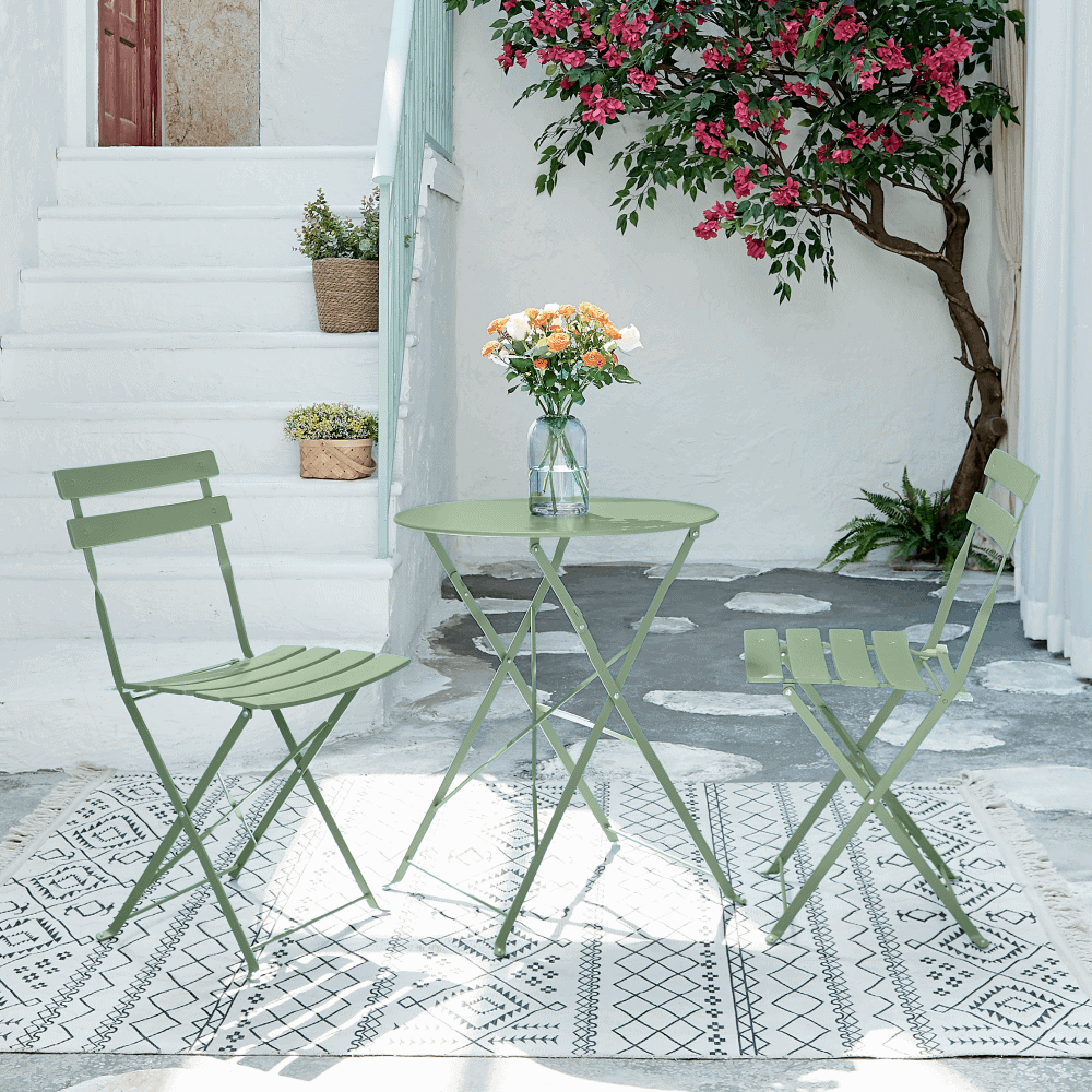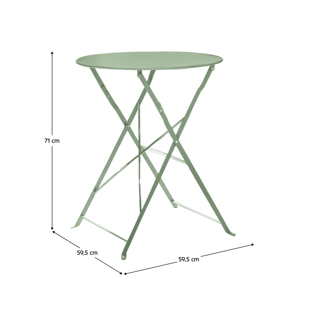 Material: oţel Culoare: verde Dimensiuni masă (LxAxÎ): 59,5×59,5×71 cm Dimensiuni scaun (LxAxÎ): 42x51x81 cm Înălţime scaun: 45 cm Adâncime scaun: 30/38 cm Lăţime scaun: 42 cm Înălţime spătar: 41 cm Lăţime spătar: 42 cm Capacitate de încărcare a mesei: 60 kg Capacitatea de încărcare a scaunului: 100 kg Set de 3 piese 1x masă 2x scaune Setul este pliabil Livrat asamblat