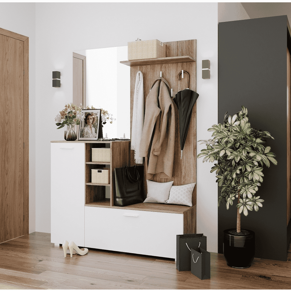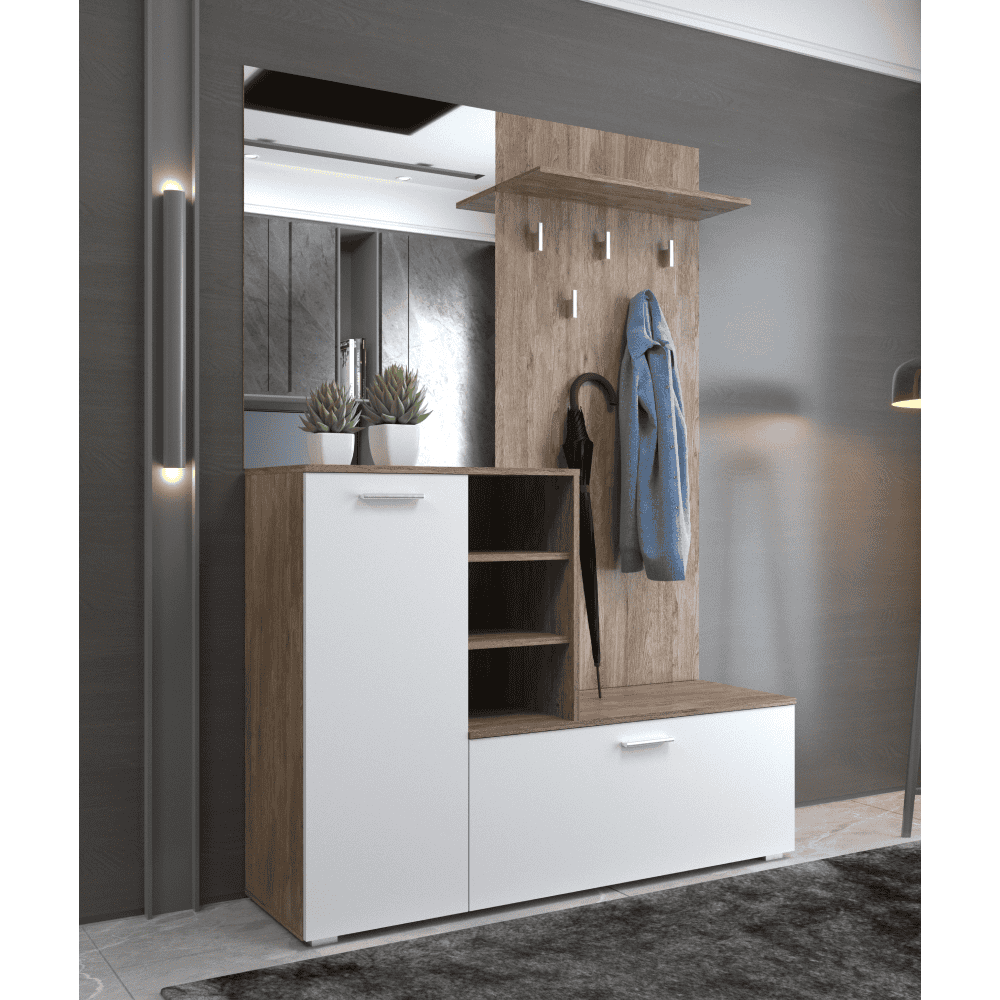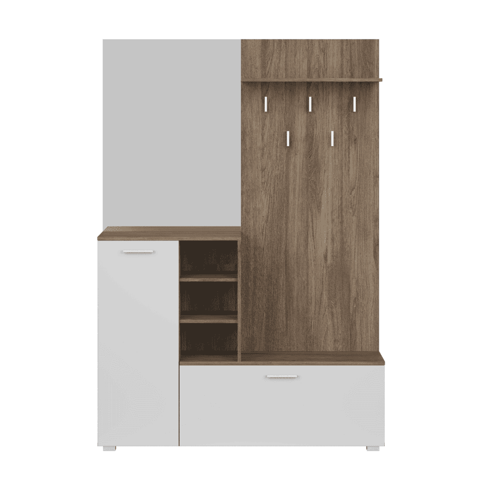 Material: PAL melaminat Material margini: hârtie impregnată cu polimeri termorigizi Culoare: stejar ansberg / albă Dimensiuni (LxAxÎ): 140x40x200 cm Grosime material: 1,6 cm Material picioare: plastic Culoarea picioarelor: argintie Dulap de încălţăminte cu deschidere basculantă Dimensiunile dulapului de încălţăminte (LxA): 99,7×41,5 cm Oglindă Compartiment de depozitare deschis Dulap cu rafturi Raft Zonă pentru umeraşe Cinci cârlige argintii Material cârlige: AKCES-PLAST Mânere din plastic Culoarea mânerelor: argintie Balamale glisante Vă recomandăm să ataşaţi mobilierul de perete Livrat dezasamblat