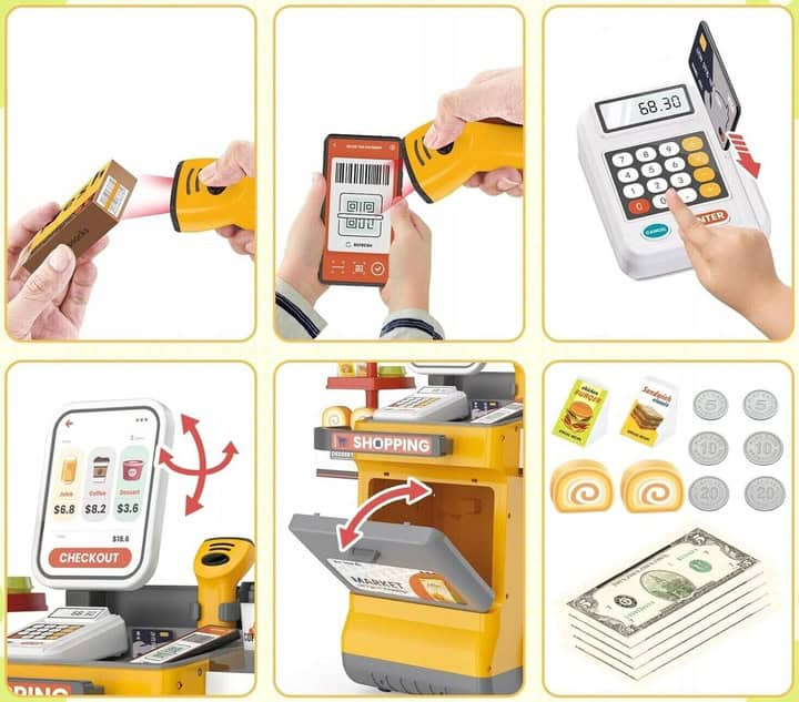 Specificatii tehnice: Dimensiuni produs: 48×29.5×58 cm Inaltime lada: 36.5 cm Accesorii incluse: Produse alimentare, cosulete, polite Functii: Sunete, scaner functional, spatii de depozitare Alimentare casa: 2xAA 1.5V (nu sunt incluse) Alimentare scaner: 2xAAA 1.5V (nu sunt incluse) Varsta recomandata: 3+ ani Scurta descriere: Setul de magazin cu lada pe roti este o jucarie interactiva ce stimuleaza creativitatea si jocurile de rol. Include scaner cu sunet si numeroase accesorii alimentare, perfecte pentru joaca zilnica. Caracteristici principale: Casa si scaner cu sunete Lada pe roti pentru mobilitate Rafturi si cosulete pentru organizare Accesorii alimentare incluse Ideal pentru jocuri de rol