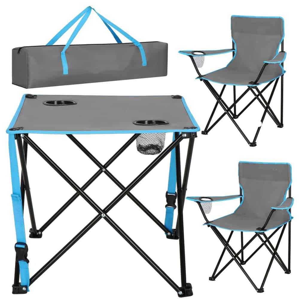 - Acest set pliabil cu masa si doua scaune este solutia ideala pentru excursii, camping sau momente relaxante pe balcon. Designul usor si compact permite transportul facil si depozitarea fara efort. Cu structura metalica rezistenta si material textil durabil, ofera confort si stabilitate in orice context outdoor. Caracteristici principale: