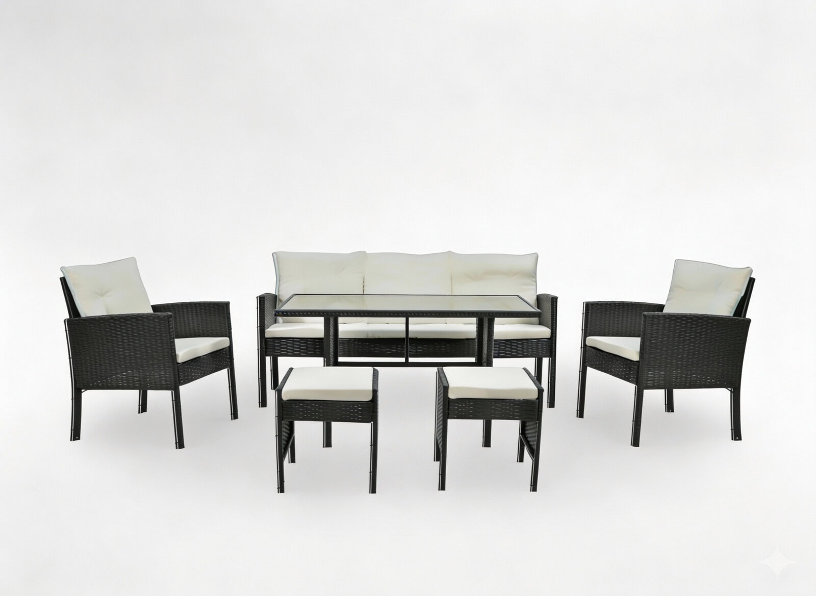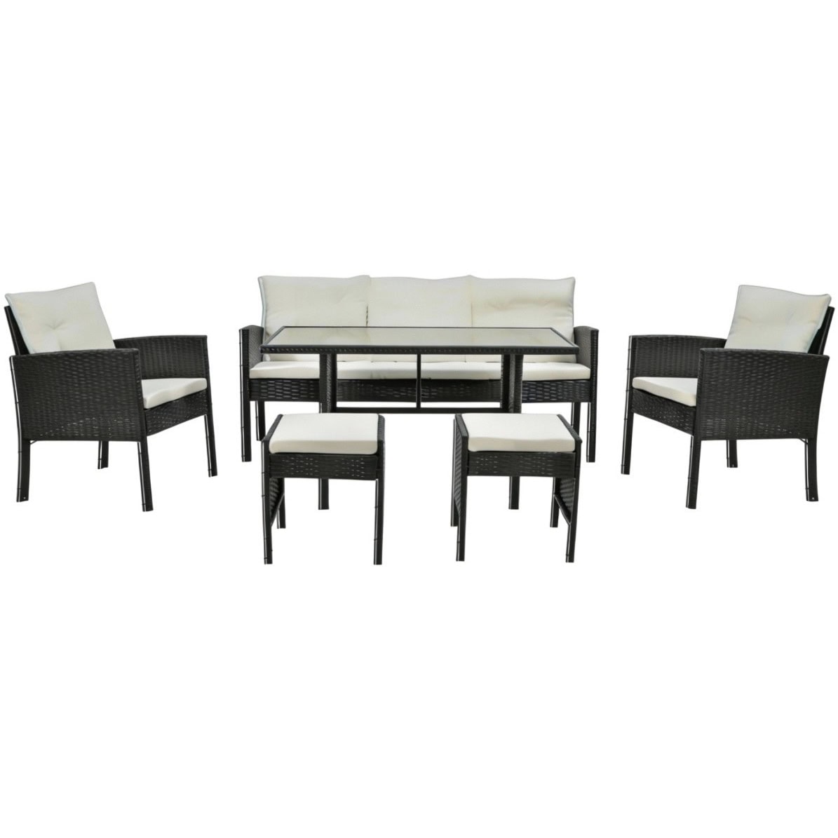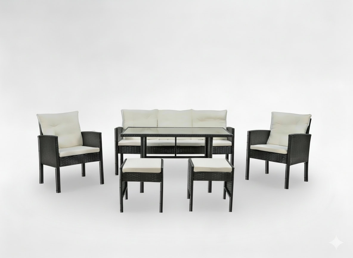 Set mobilier gradina Vaduz 6 piese, canapea 3 locuri, 2 fotolii, 2 tabureti si masa, ratan sintetic, blat sticla, negru si crem Mob360