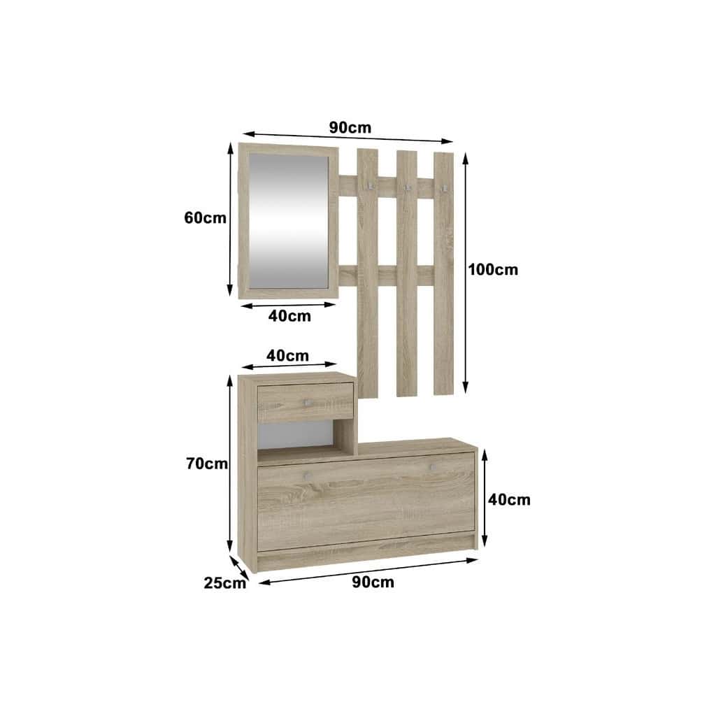 Set mobilier hol cu pantofar, oglinda, sertar si cuier metalic, PAL laminat, 90x25x170 cm, stejar sonoma Mob360