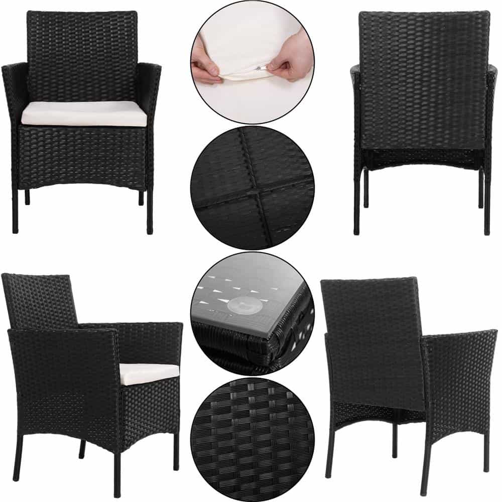 Culoare: negru Material: tehnorattan, sticla securizata, spuma poliester/PP Produse pentru auto-asamblare – instructiuni incluse Scaun: 82 x 58 x 50 cm Masa: 41 x 41 x 41,5 cm Acest set de gradina din 3 piese, cu perne este o completare excelenta pentru gradina si curtea dvs. De asemenea, este perfect potrivit ca set de mobilier pentru sufragerie. Setul de mobilier de gradina include o masa, doua scaune si doua perne confortabile. Setul de mobilier pentru balcon este realizat dintr-o constructie confortabila, dar solida. Are, de asemenea, un efect de ratan, ceea ce o face o piesa impresionanta si usor de intretinut pentru stilul dvs. de gradina. Mobilierul nostru de gradina este fabricat din materiale de cea mai buna calitate, ceea ce garanteaza durabilitatea si longevitatea lor. Datorita acestui fapt, ele sunt rezistente la lumina soarelui, la ploaie si la schimbarile de temperatura, ceea ce inseamna ca va pot servi timp de mai multe sezoane, pastrandu-si valorile estetice. Pernele incluse in set sunt umplute cu spuma moale. Toate au fete de perna cu fermoar, din poliester.Fetele de perna sunt impregnate si impermeabile, ceea ce ofera si o mare protectie impotriva petelor si murdariei!