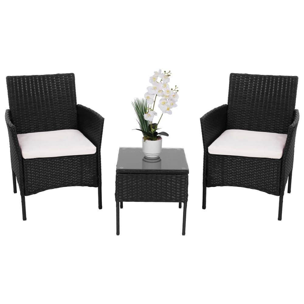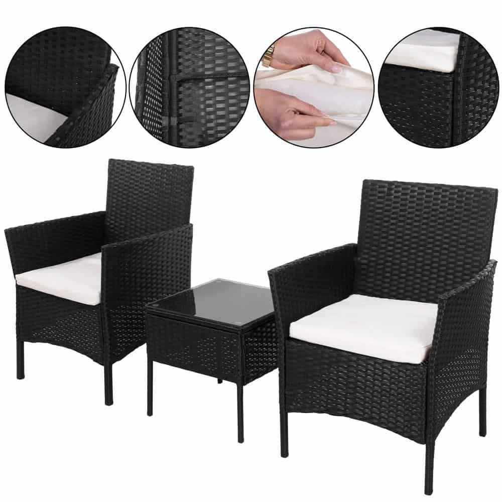 Set mobilier terasa, din tehnorattan, masa cu blat sticla securizata, 2 fotolii cu perne, negru Mob360 – produs disponibil în magazinul Mob360.