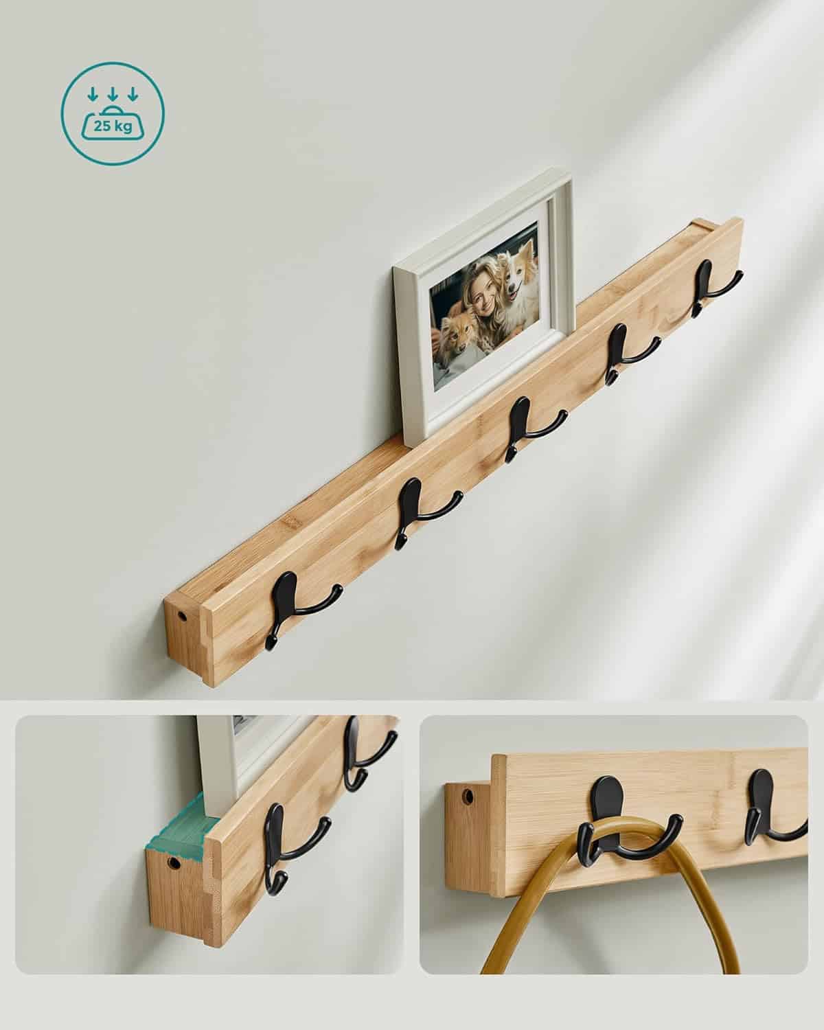 Suportul pentru haine din bambus cu banca de pantofi este solutia perfecta pentru organizarea spatiului de intrare impreuna sau separat. Acest set este format din 5 carlige metalice duble care va permit sa atarnati comod haine, genti de mana sau palarii si o mica adancitura suplimentara pentru decorarea cu propriile decoratiuni sau fotografii. Iar banca este dotata cu 3 nivele, ceea ce asigura depozitarea practica a pantofilor. Specificatii: Culoare: maro natur Material: Bambus, material textil, lemn Dimensiunea bancii pentru pantofi: 28.7 x 70.1 x 45.3 cm Dimensiunea fiecarui raft: 4.8 x 70 x 7 cm Max. Capacitatea de incarcare statica a bancii pentru pantofi: 136 kg Max. Capacitatea de incarcare statica a fiecarui carlig pentru haine: 5 kg Note: Nu depasiti capacitatea de greutate. Despre acest articol Elegant si practic: Combinatia de cuier si banca pentru pantofi ofera un amestec de utilitate si stil, asigurand ca totul este bine organizat. Cuier de hol 4 in 1 cu banca: Acest set combina un raft pentru decoratiuni, 5 carlige duble pentru genti, haine si umbrele, o banca pentru schimbarea pantofilor si 2 rafturi inferioare. Acum, puteti avea tot ce aveti nevoie pentru iesirea in oras intr-un singur loc! Suport fiabil: Realizata din bambus natural, banca pentru pantofi este proiectata pentru durabilitate indelungata. Se mandreste cu o capacitate de sedere de pana la 136 kg si fiecare nivel poate gazdui confortabil 3 perechi de pantofi. Asamblare simplificata: Suportul pentru haine vine preasamblat pentru a va economisi timp si efort. Instructiunile detaliate sunt incluse pentru a va ghida cu usurinta prin restul procesului de asamblare. Versatil: Fie ca sunt utilizate impreuna sau separat, cuierul si banca pentru pantofi pot fi amplasate in diverse contexte, cum ar fi intrarea, camera de zi sau dormitorul, adaptandu-se preferintelor dvs. specifice si completand orice spatiu.