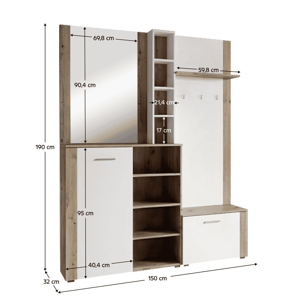 Material: PAL melaminat Culoare: alb/stejar artisan Dimensiuni (Lxlxh): 150x32x190 cm Pantofar Oglindă Dimensiuni oglindă (Lxlxh): 69,8×1,9×90,4 cm Spaţiu de depozitare deschis Dulap cu poliţe Dimensiuni dulap (Lxh): 40,4×95 cm Poliţă Două cârlige Portanţa cârligului: 1 kg AKCES-PLAST Mânere din plastic Culoarea mânerelor: argintie Vă recomandăm să ataşaţi mobilierul de perete Livrat dezasamblat