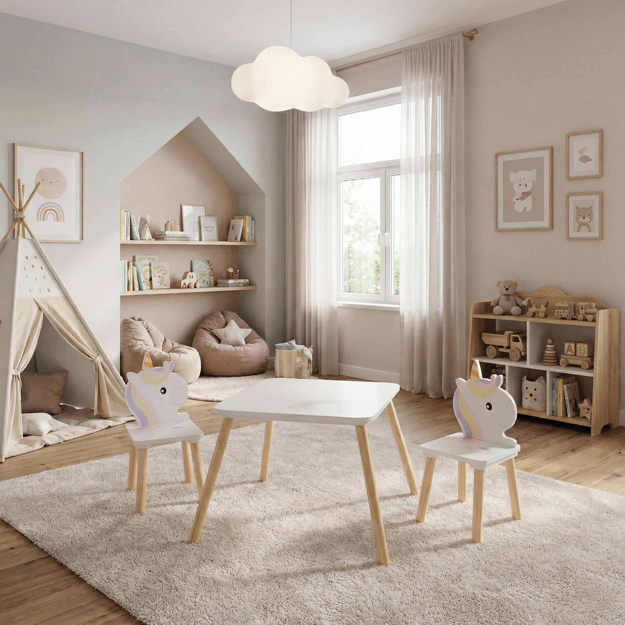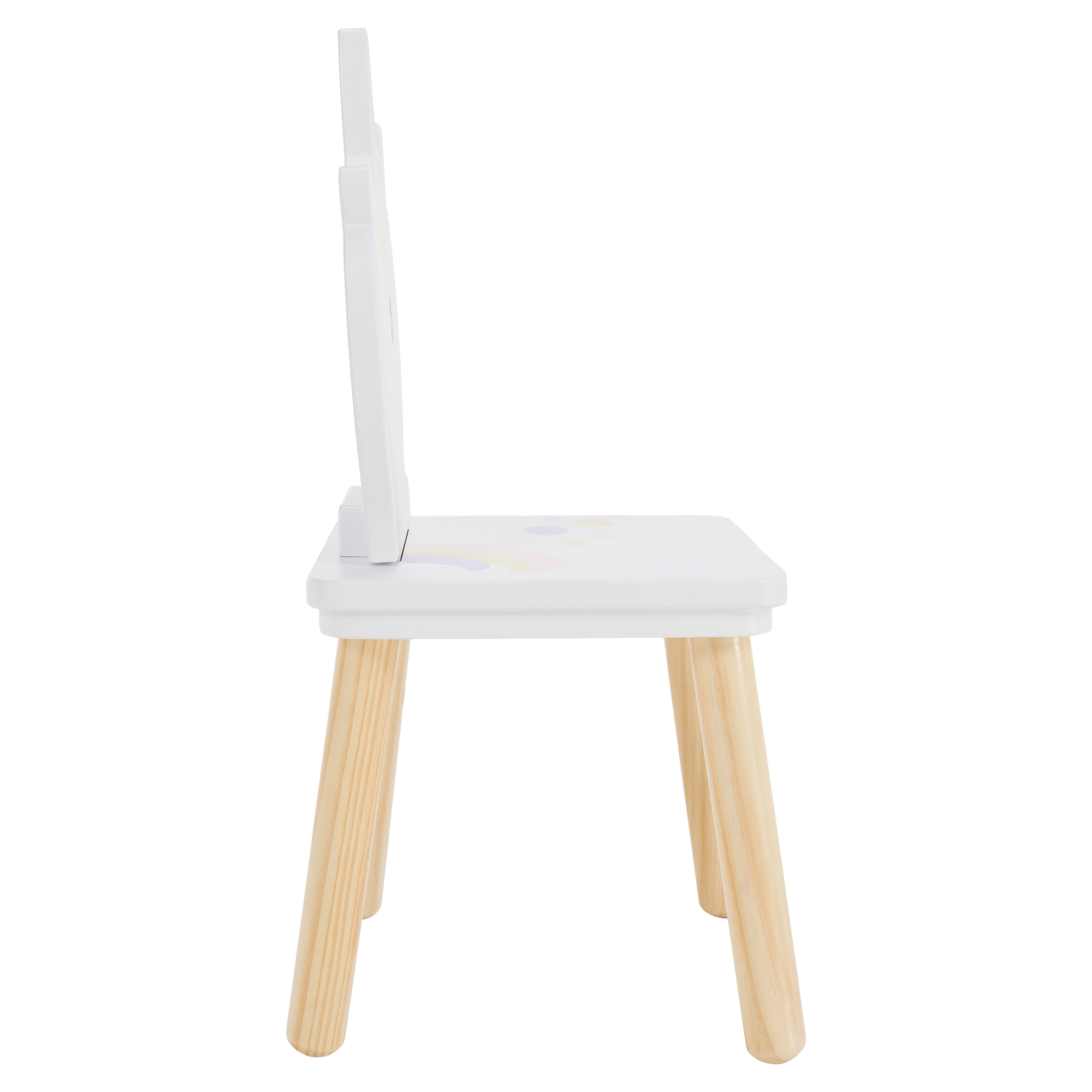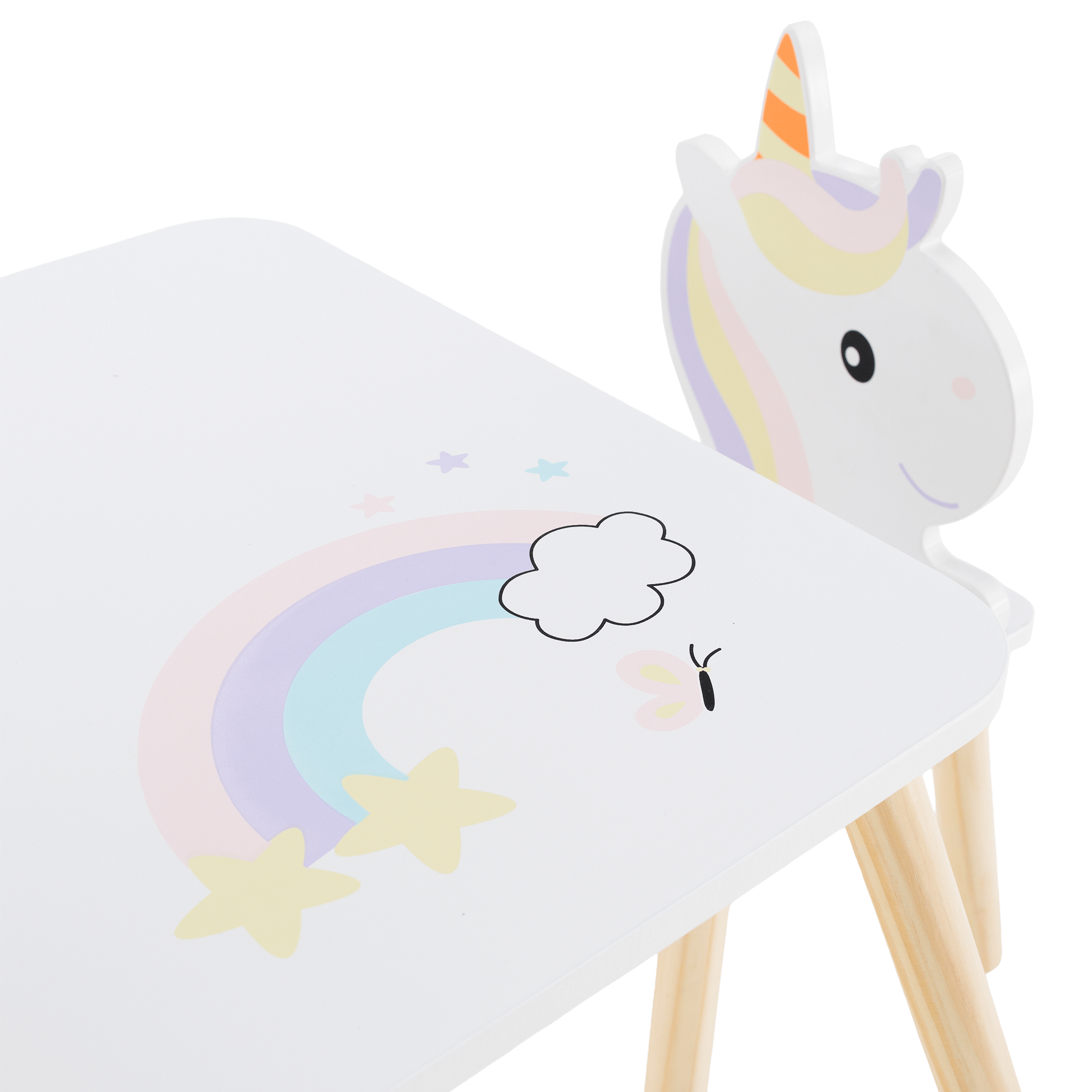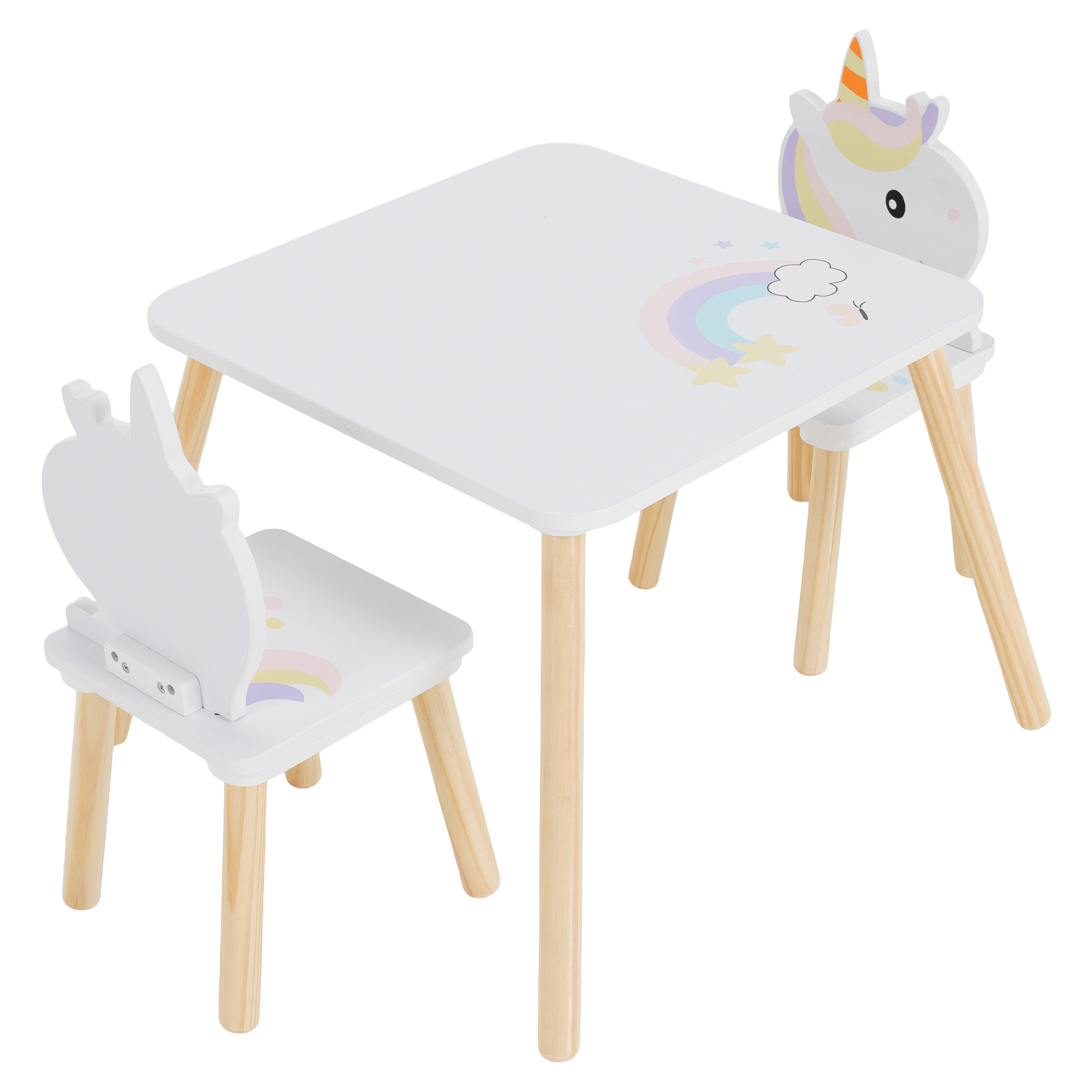 Material: MDF/lemn masiv de pin Culoare: alb/natural/motiv unicorn pentru copii Dimensiuni masă (lxAxh): 50x50x42,5 cm Portanţă măsuţă: 50 kg Dimensiunile scaunului (lxAxh): 24x28x49,5 cm Portanţa a scaunului: 50 kg Înălţimea părţii de şezut: 20 cm Grosime material: 1,2-1,5 cm Set 1+2 1x masă 2x scaun Design magic Ideal pentru desen, joacă sau sărbători mici Potrivit pentru camera copiilor, grădiniţă şi zonă de joacă Dimensiune ideală pentru copii Margini rotunjite Utilizare în interior Curăţaţi cu o cârpă moale umedă şi apoi ştergeţi Să nu aşezaţi acest produs lângă o fereastră, astfel încât copilul să nu-l folosească ca treaptă şi să cadă Potrivit pentru copii cu vârsta cuprinsă între 3 şi 7 ani Îndeplineşte standardele de siguranţă EN 17191:2021 Livrat dezasamblat