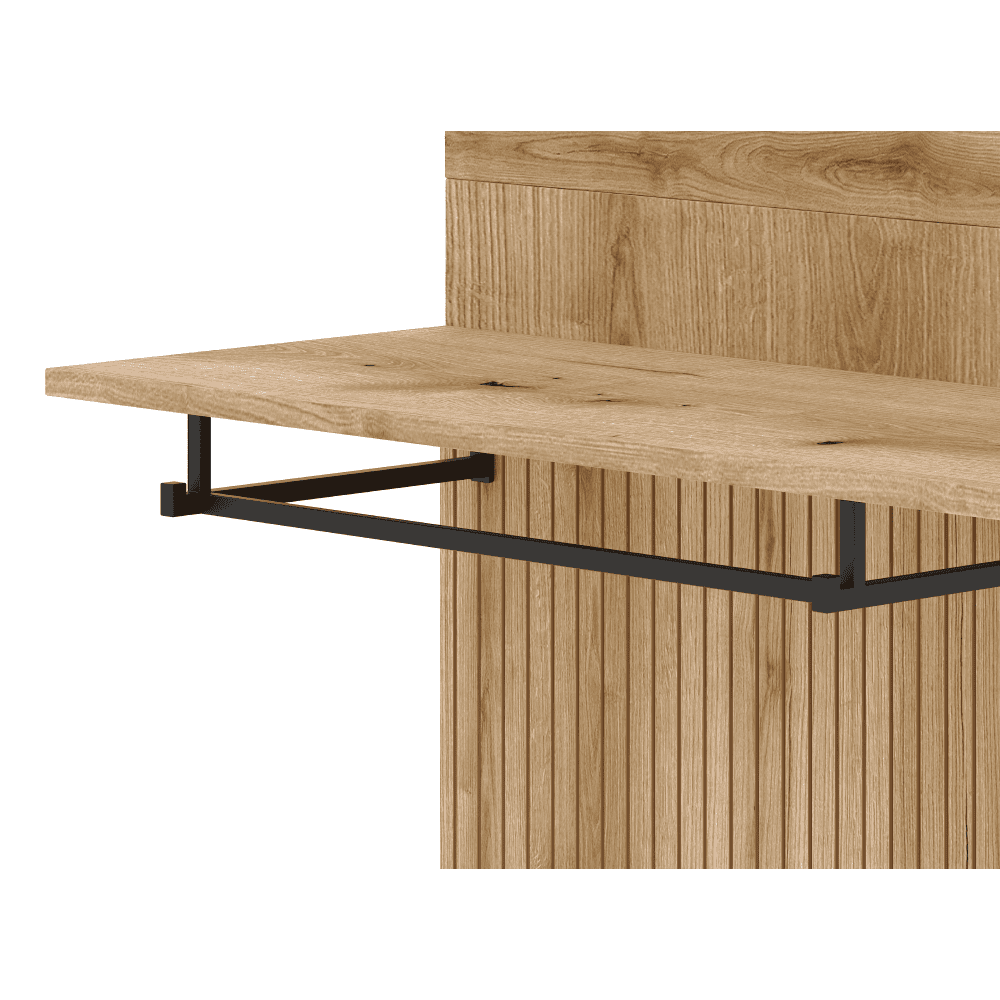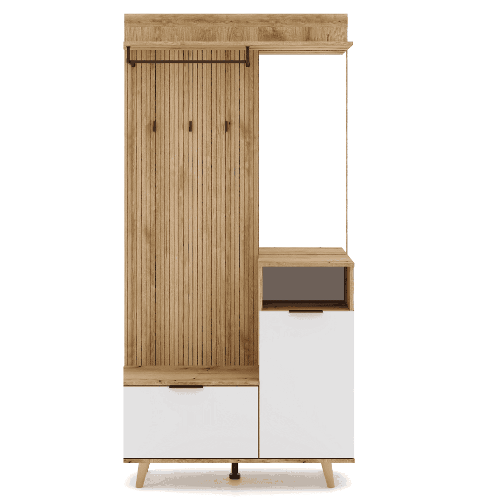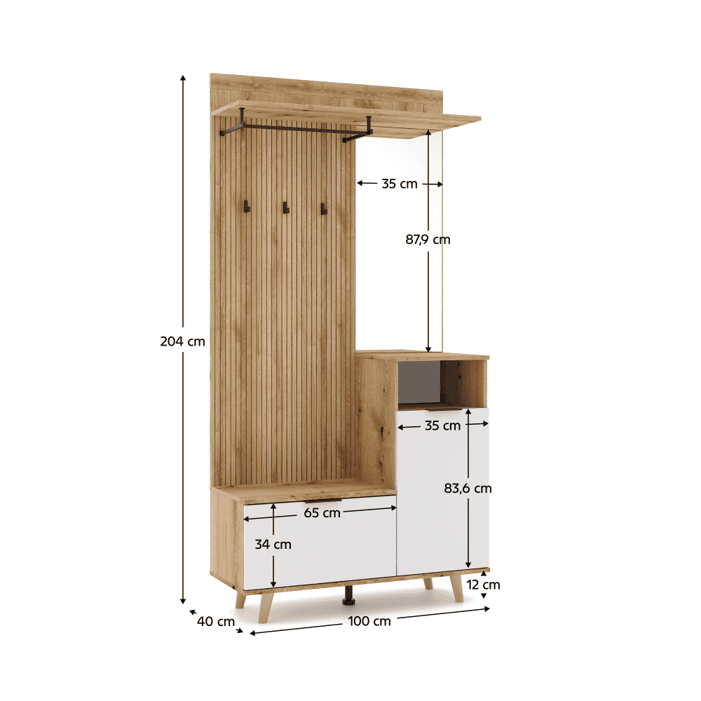 Material: DTD/ABS margini Culoare: stejar evoke/alb Dimensiuni (Lxlxh): 100x40x204 cm Grosime material: 1,6 cm Spaţiu de depozitare deschis Dulap cu poliţe Dimensiuni dulap (Lxh): 35×83,6 cm Portanţa raftului: 5 kg Pantofar cu balamale Dimensiuni pantofar (Lxh): 65×34 cm portanţa blatului superior la pantofar: 10 kg Bară pentru umeraşe Portanţa barei pentru umeraşe: 1 kg 3 cârlige Portanţa cârligului: 1 kg Cu oglindă Dimensiuni oglindă (Lxh): 35×87,9 cm Panou decorativ cu lamele 3D Cu mânere Pe picioare Material picior: lemn Picior de sprijin mijlociu Material picior de sprijin: plastic Înălţime de jos de la podea: 12 cm Vă recomandăm să ataşaţi mobilierul de perete Livrată dezasamblată
