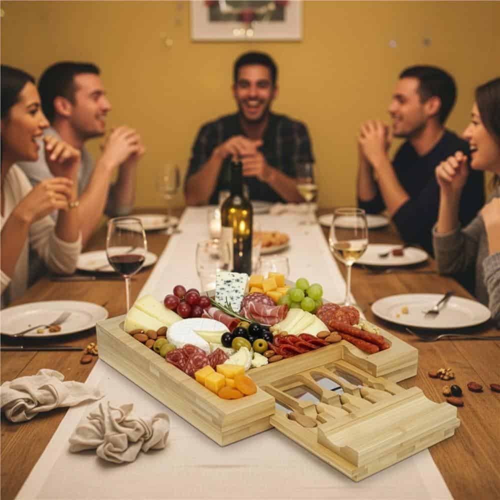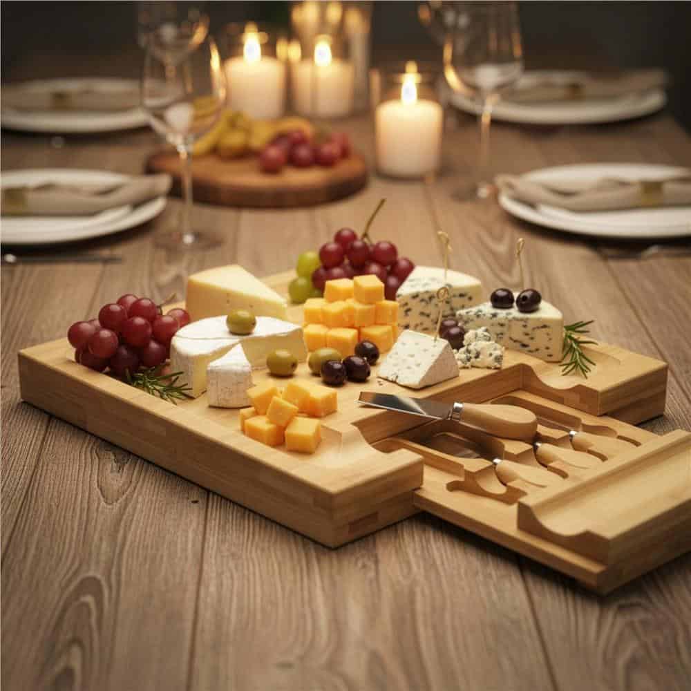 - Setul pentru servirea branzeturilor este realizat din bambus natural si include un sertar glisant pentru depozitarea accesoriilor. Designul compact si functional permite organizarea eficienta a produselor si acces rapid la cutite si furculita, fiind ideal pentru servirea aperitivelor in mod elegant. Caracteristici principale: