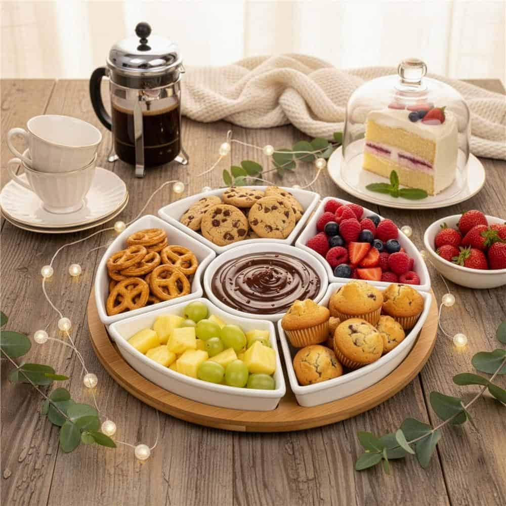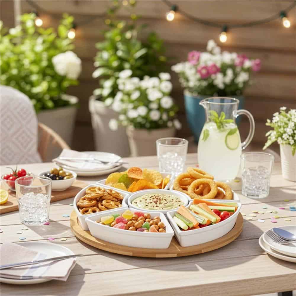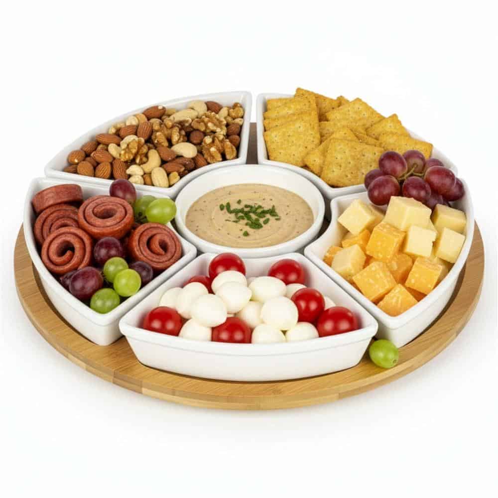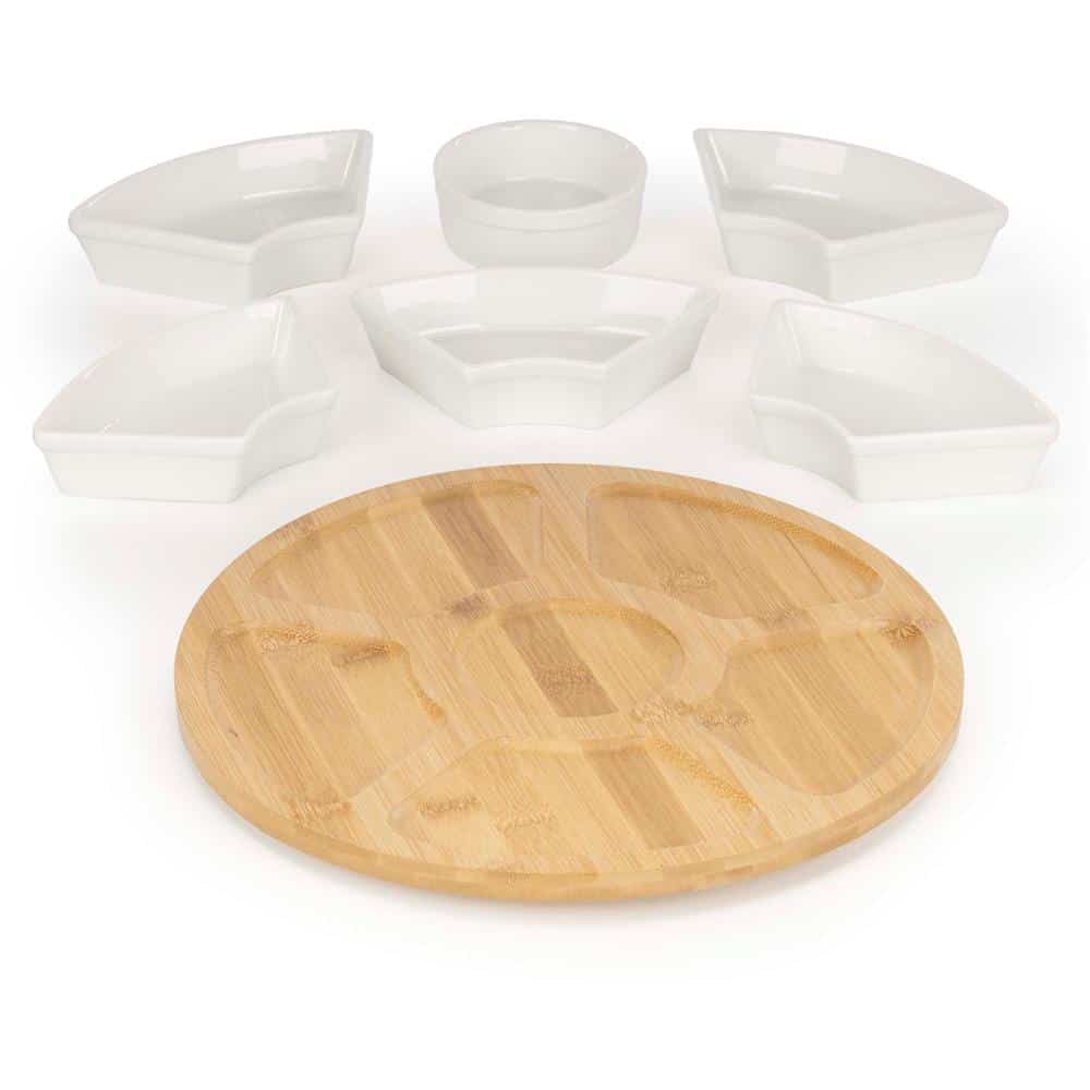 - Setul rotativ pentru servirea aperitivelor este ideal pentru organizarea gustarilor intr-un mod elegant si practic. Platoul din bambus este prevazut cu mecanism rotativ 360°, iar bolurile din portelan permit servirea diferitelor tipuri de alimente, de la sosuri la snacks-uri. Caracteristici principale: