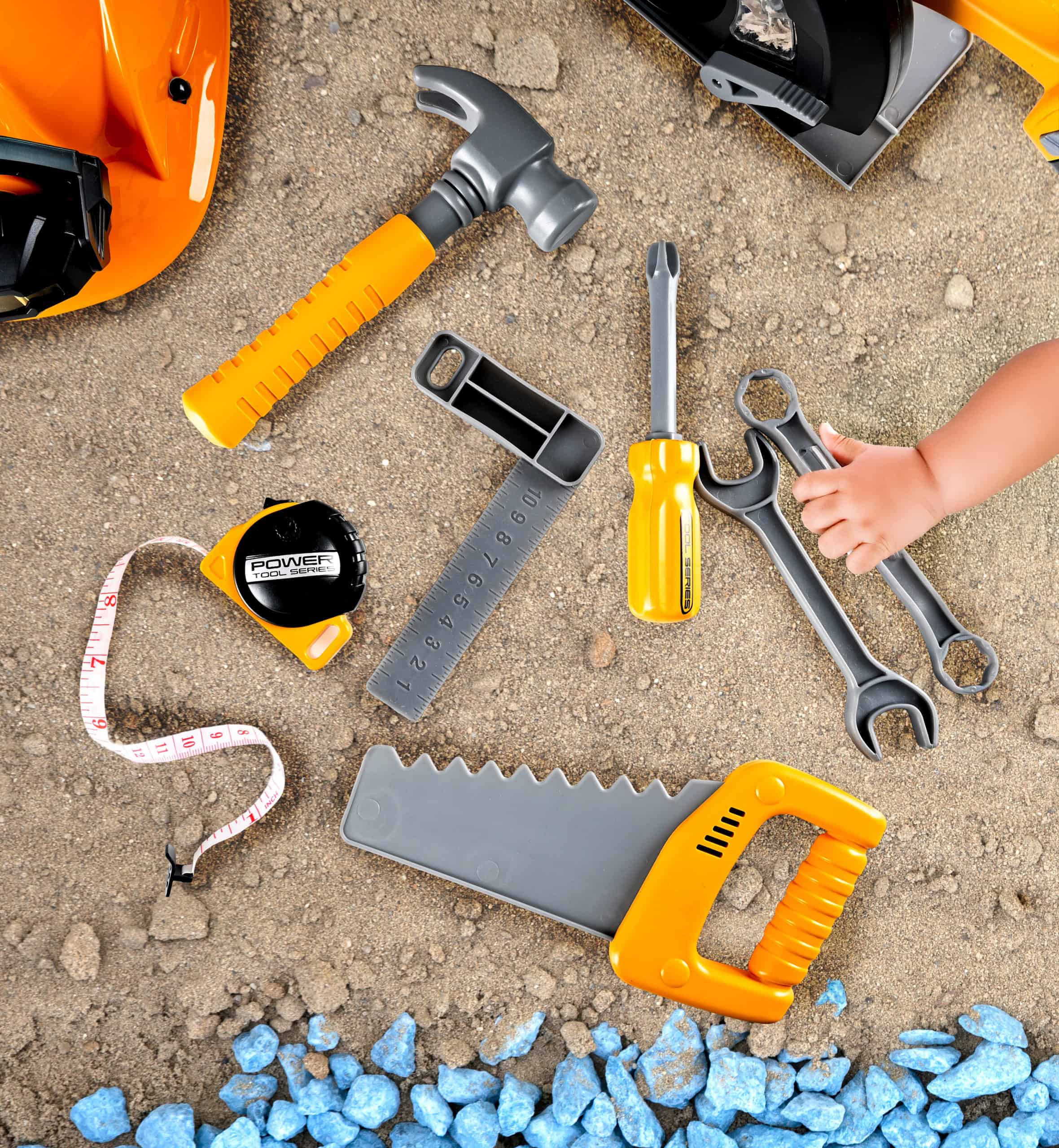 Set unelte pentru copii cu bormasina, fierastrau, casca luminata si vesta de constructor, 29x27x21 cm Mob360