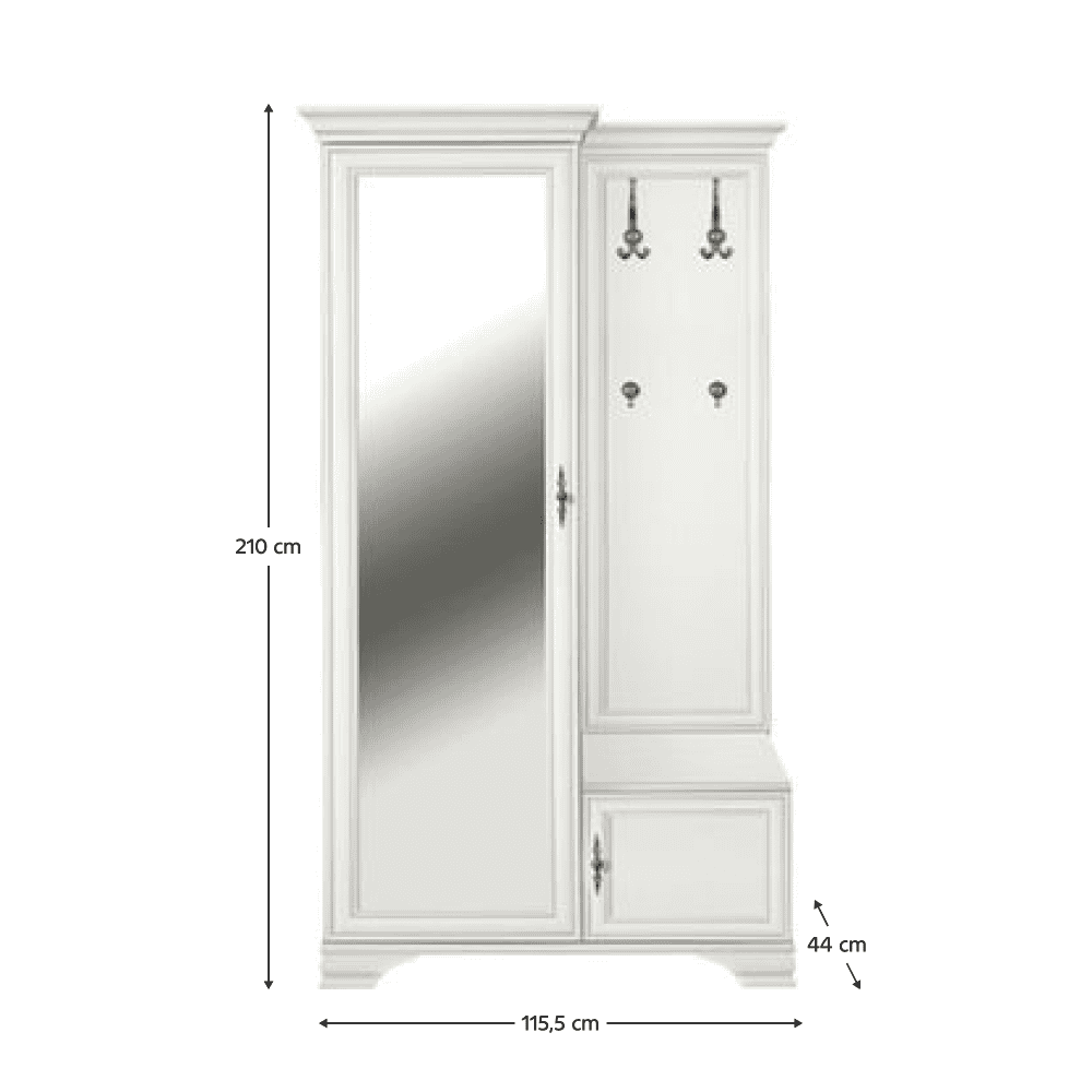 Material: DTD laminat Culoare: alb alpin Dimensiuni (lxAxh): 115,5x44x210 cm Grosime material: 1,6 cm Mânere metalice Culoarea mânerului: argintiu antic Oglindă Dulap cu poliţă Portanţă poliţă: 4kg Zonă de umeraşe Cârlige metalice Culoarea cârligului: argintiu antic Portanţa cârligelor: 5 kg.Pe picioare. Înălţime picioare: 8 cm Varianta pe stânga Recomandăm fixarea de perete Livrat dezasamblat