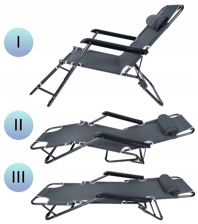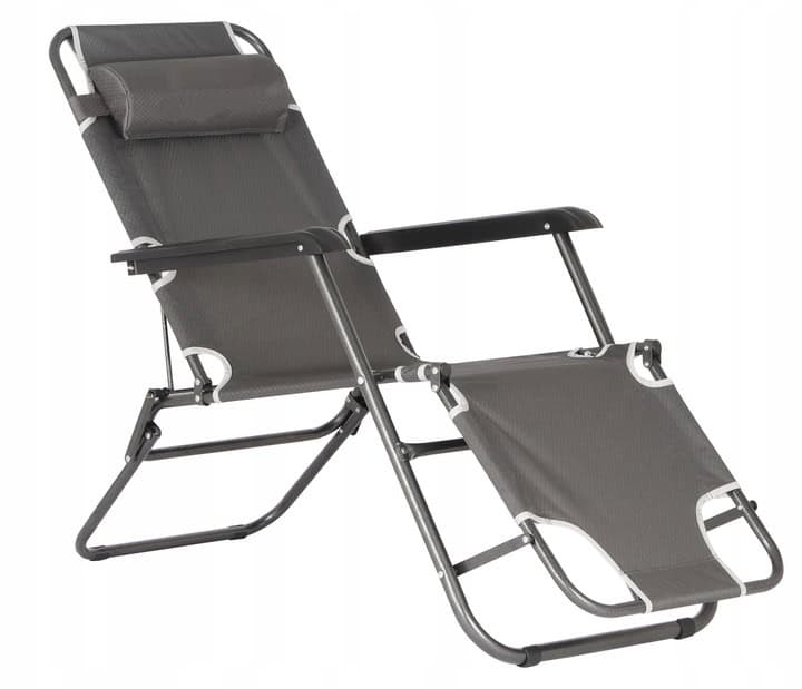 Sezlong pliabil, cadru metalic, reglabil in 3 pozitii pana la complet orizontal, cu tetiera, 153×60 cm, gri Mob360