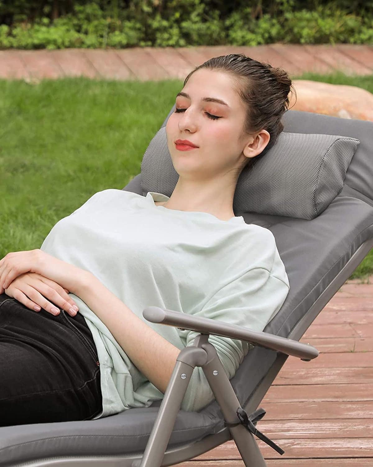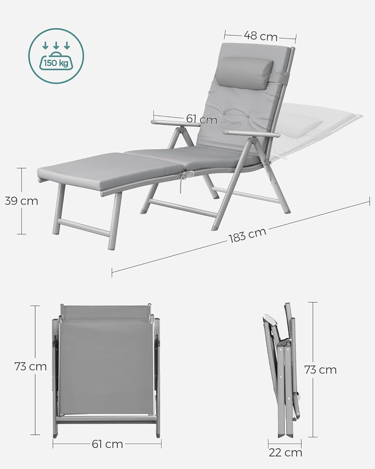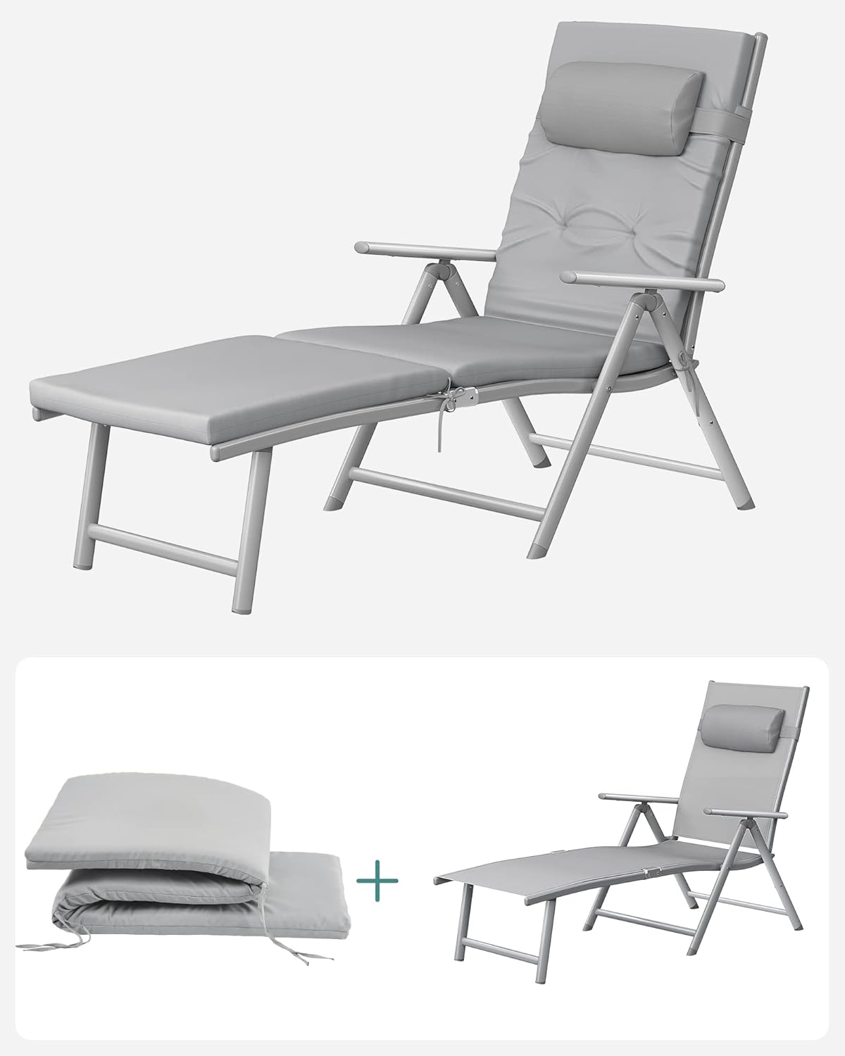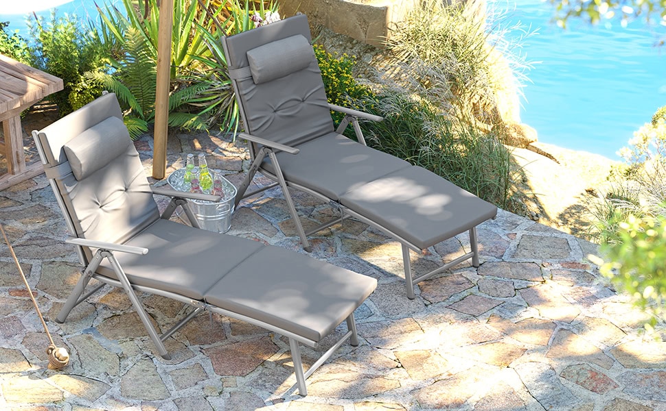 Sezlong pliabil, cu saltea groasa si tetiera, spatar reglabil, maxim 150kg, 183x60x39cm, gri Mob360
