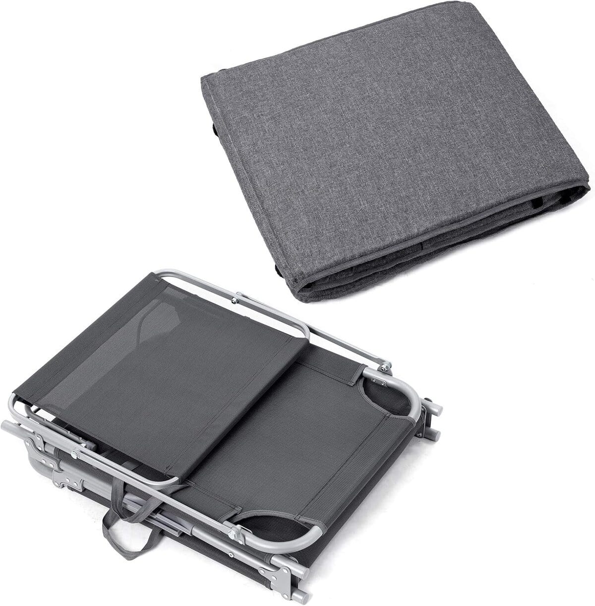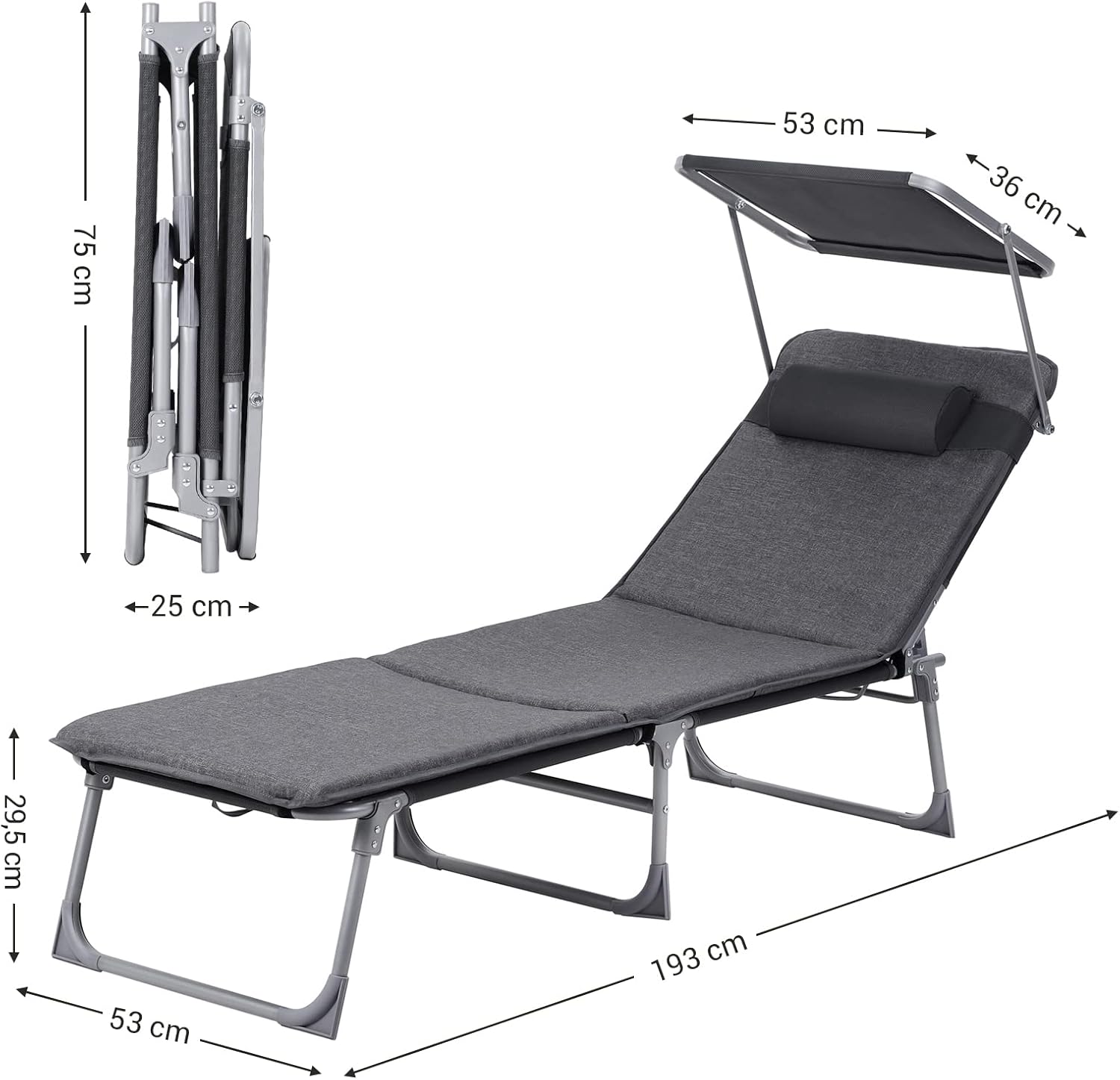 Sezlong pliabil, cu saltea, parasolar si tetiera, spatar reglabil in 4 pozitii, maxim 150kg, 193x53x30 cm, gri Mob360