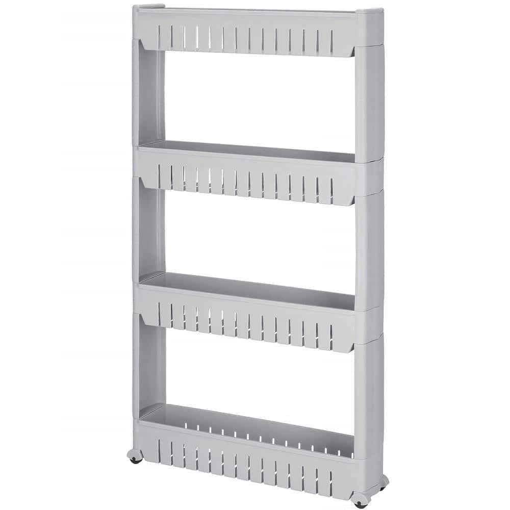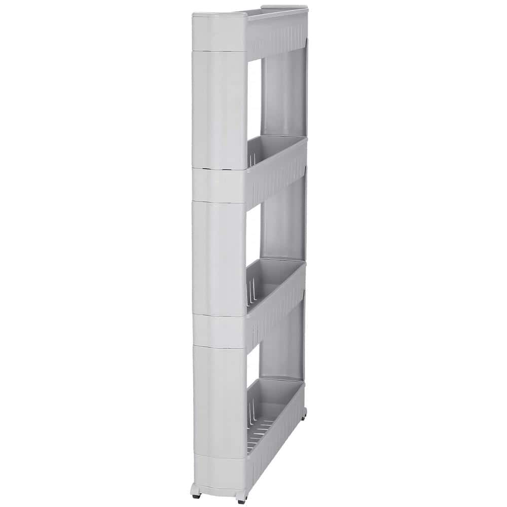 - Etajera verticala cu 4 polite, realizata din plastic rezistent, ideala pentru organizarea obiectelor in spatii inguste. Designul compact permite amplasarea in baie, bucatarie sau camara, oferind acces facil si ordine eficienta. Caracteristici principale: