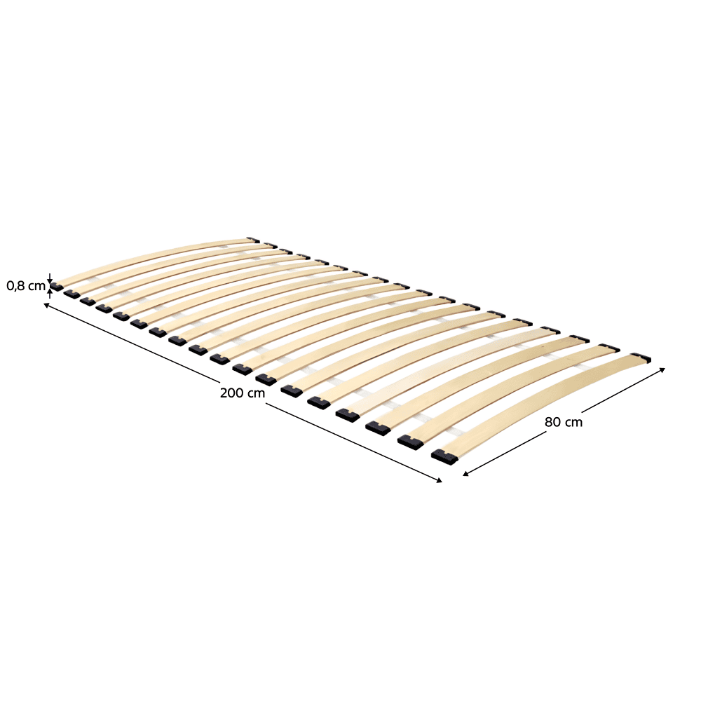 Material: lamele flexibile/bandă de tapiţerie/carcase din plastic Design: placaj de mesteacăn Dimensiuni (lxh): 80×200 cm Număr de lamele: 18 cm Grosimea lamelelor: 0,8 Lăţimea lamelelor: 5,3 cm. Spaţiul dintre lamele: 5,5 cm Portanţă: 150 kg/persoană Potrivit pentru toate tipurile de saltele Construcţie fără ramă Potrivit pentru paturi cu şine laterale pentru fixarea somierei Somieră roluibilă Lamele din placaj de mesteacăn conectate cu bandă de tapiţerie Montate în carcase de plastic Livrată cu şuruburi pentru fixarea pe pat Somiera nu este auto-portantă Fiecare somieră este cu 1 cm mai îngustă şi cu 5 cm mai scurtă faţă de dimensiunea specificată, de exemplu 90×200 = 89×195 cm.