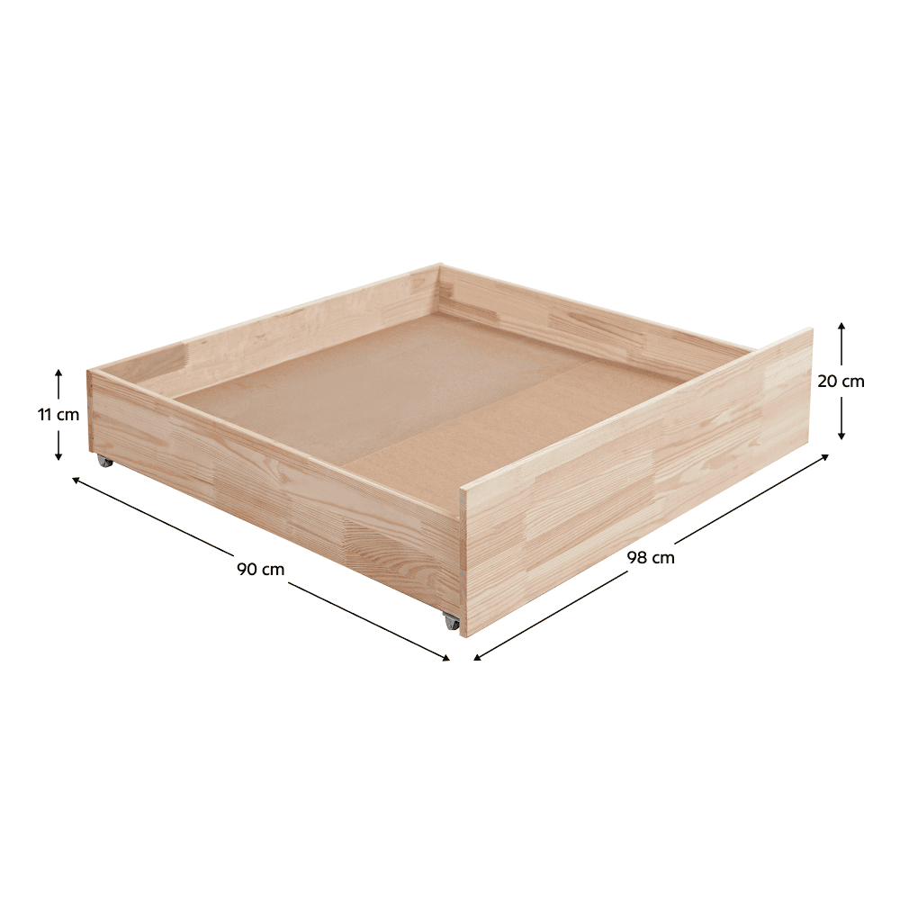 Material: molid Culoare: natural Dimensiuni (lxAxh): 98x90x20 cm Grosime material: 1,8 cm Portanţă: 5 kg Spaţiu de depozitare Cu roţi Pentru depozitarea jucăriilor, hainelor sau lenjeriei de pat Potrivit pentru paturile BENY din oferta noastră Design modern Produs slovac de calitate Livrat dezasamblat