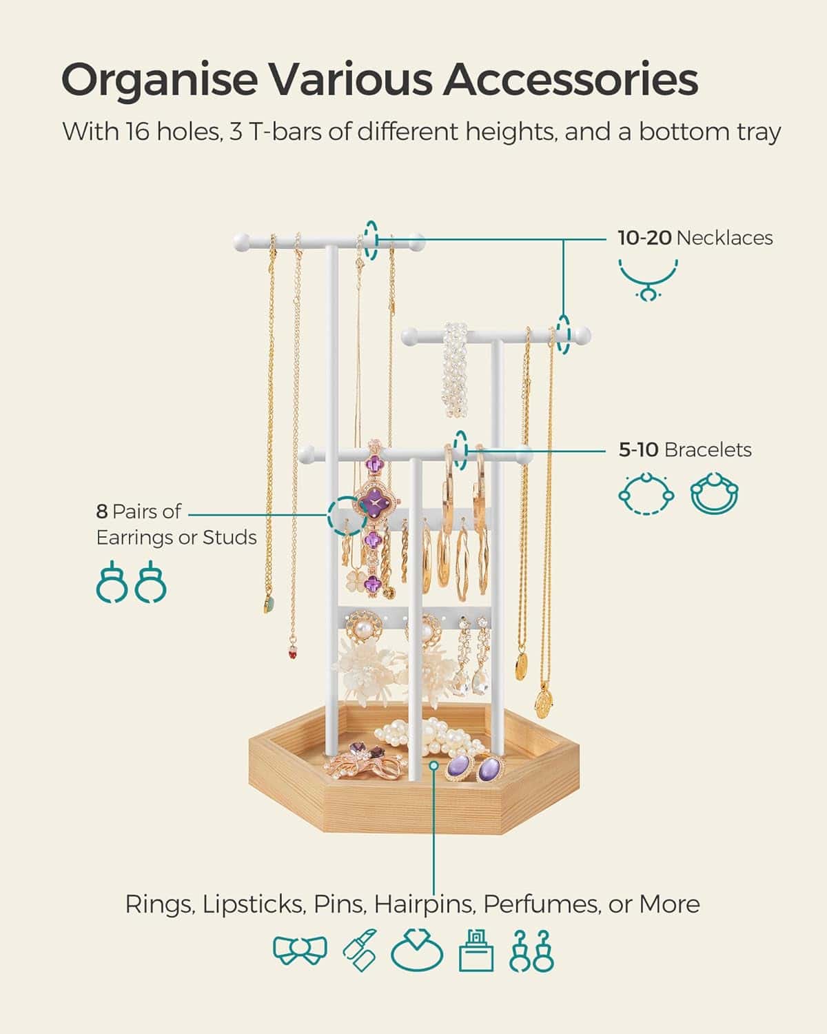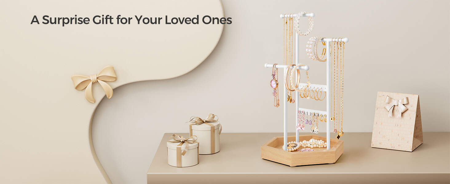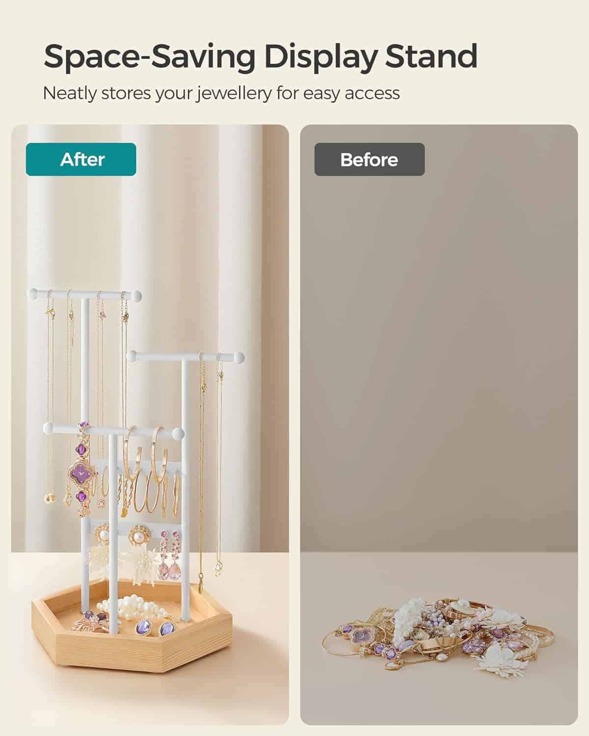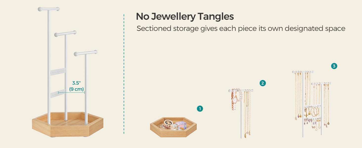 Tonurile clasice de alb si bej natural confera acestui suport de bijuterii un aspect elegant, ceea ce il face o alegere perfecta de cadou pentru cei dragi.Acest suport de bijuterii are 16 gauri pentru cercei, 3 bare in T de diferite inaltimi si o tava inferioara pentru cercei, inele, bratari si coliere, organizate si gata de purtare.Are 3 bare in forma de T de inaltimi diferite pentru a va depozita colierele lungi si scurte sau bratarile, un panou pentru cercei si o tava inferioara pentru inele si alte accesorii.Suportul pentru bijuterii este un refugiu stabil si sigur pentru bijuteriile dvs.