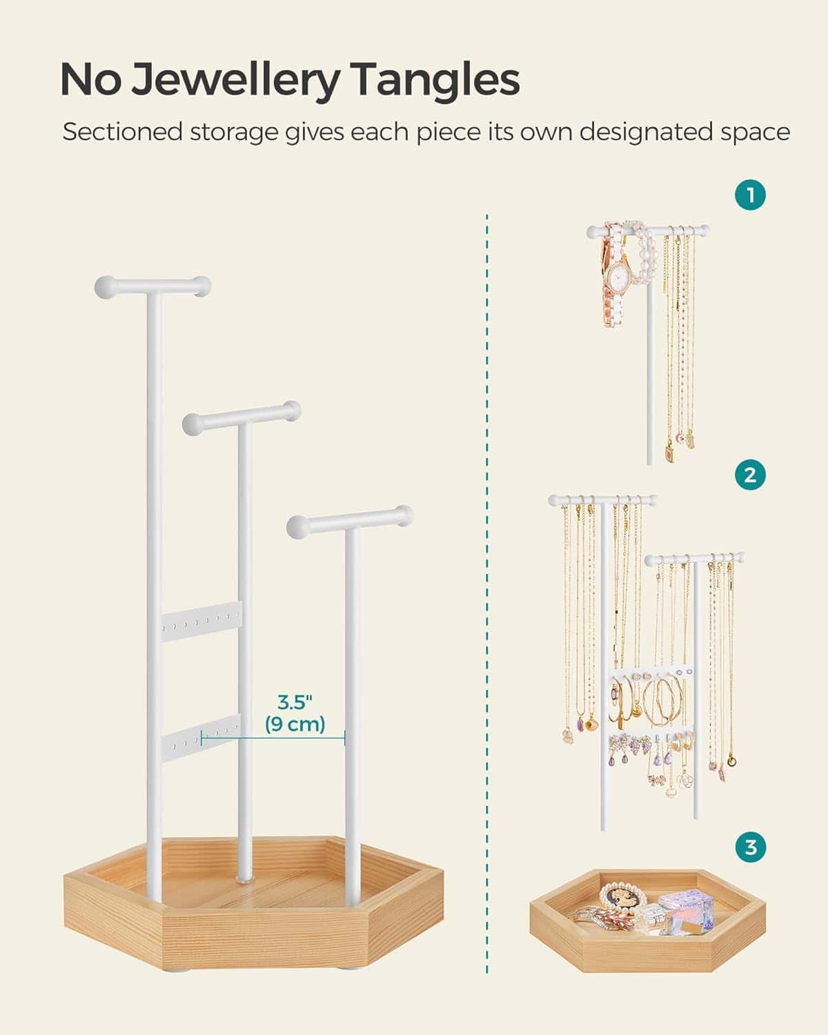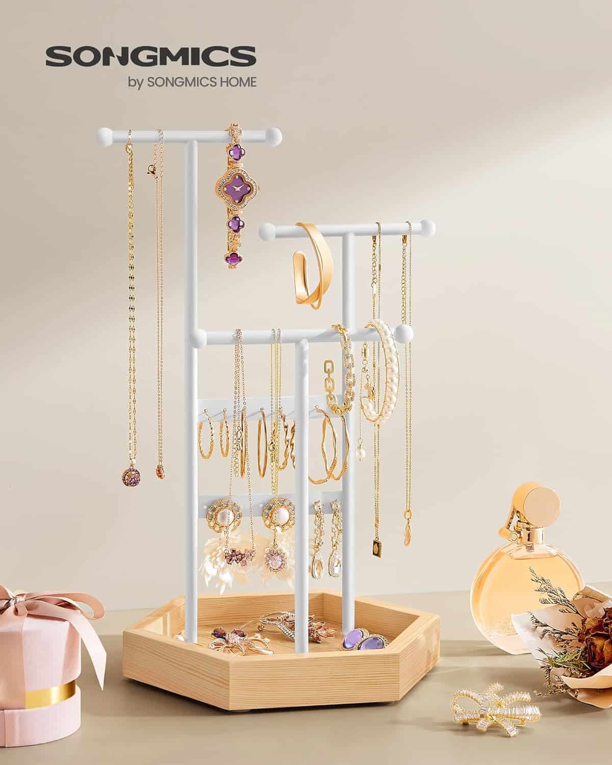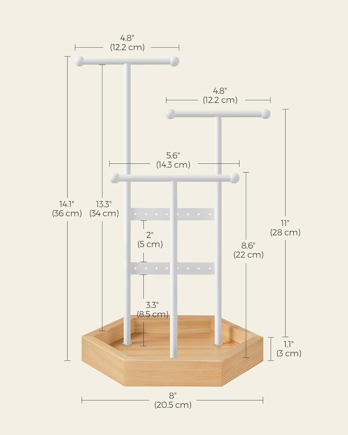 Tonurile clasice de alb si bej natural confera acestui suport de bijuterii un aspect elegant, ceea ce il face o alegere perfecta de cadou pentru cei dragi.Acest suport de bijuterii are 16 gauri pentru cercei, 3 bare in T de diferite inaltimi si o tava inferioara pentru cercei, inele, bratari si coliere, organizate si gata de purtare.Are 3 bare in forma de T de inaltimi diferite pentru a va depozita colierele lungi si scurte sau bratarile, un panou pentru cercei si o tava inferioara pentru inele si alte accesorii.Suportul pentru bijuterii este un refugiu stabil si sigur pentru bijuteriile dvs.