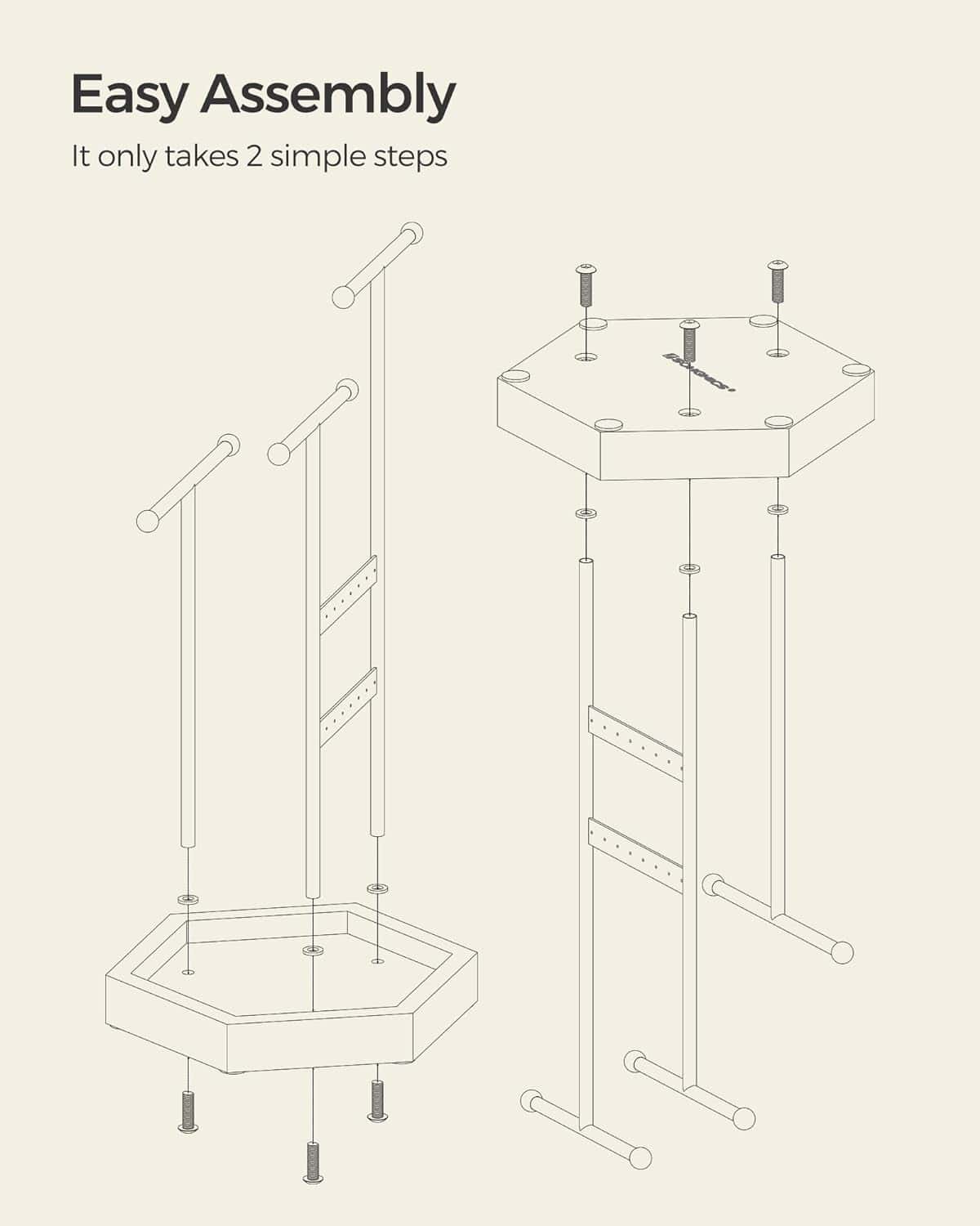 pretioase, datorita unei baze hexagonale si a 3 bare metalice in forma de T dispuse intr-o distributie triunghiulara si insurubate in siguranta la baza.Acest suport de prezentare a bijuteriilor este usor de asamblat.