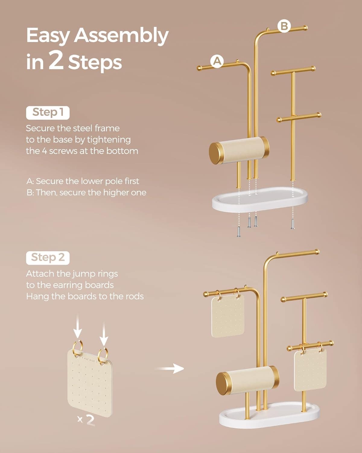 Specificatii: Culoare: Aur metalicMaterial: Otel, MDF (Medium Density Fibreboard), captuseala din catifeaDimensiunea produsului: 10.8 x 20.4 x 31.5 cmGreutatea produsului: 0,4 kg Note SONGMICS: Directia corecta de instalare este ca partea superioara a cadrului metalic mai inalt sa fie inclinata in spate.Cand instalati placa pentru cercei, deschiderea inelului de salt trebuie sa fie plasata cu fata in sus.Va rugam sa evitati lumina directa prelungita a soarelui pentru a preveni decolorarea sau deformarea bijuteriilor. Design elegant si stilat Imbunatatiti depozitarea bijuteriilor cu acest organizator elegant, cu o baza ovala unica inspirata de circuitele de masini si o dispunere bine aranjata. Este solutia perfecta pentru afisarea si pastrarea in ordine a colectiei dvs. pretioase Fara bijuterii incalcite Fa-ti accesorizarea de zi cu zi mai usoara cu acest suport pentru bijuterii. Are 1 tija inferioara pentru bratari si ceasuri, 2 bare pentru coliere, 2 panouri pentru cercei si o tava de baza pentru a va pastra bijuteriile fara incurcaturi si usor accesibile Robust, durabil si stabil Acest suport pentru bijuterii, fabricat din otel rezistent si intarit de o baza durabila din MDF, asigura o casa sigura si stabila pentru obiectele dvs. pretioase, protejandu-le de lovituri neasteptate 2 panouri adaptabile pentru cercei Acest organizator elegant pentru bijuterii include 2 panouri adaptabile cu 36 de gauri. Le puteti agata cu usurinta pe diferite tije. Ideale pentru calatorii, acestea va pastreaza cerceii aranjati ingrijit si fara incurcaturi Montaj usor Atasati doar rama din otel cu ajutorul suruburilor furnizate, iar apoi este gata sa va expuneti colectia preferata de bijuterii