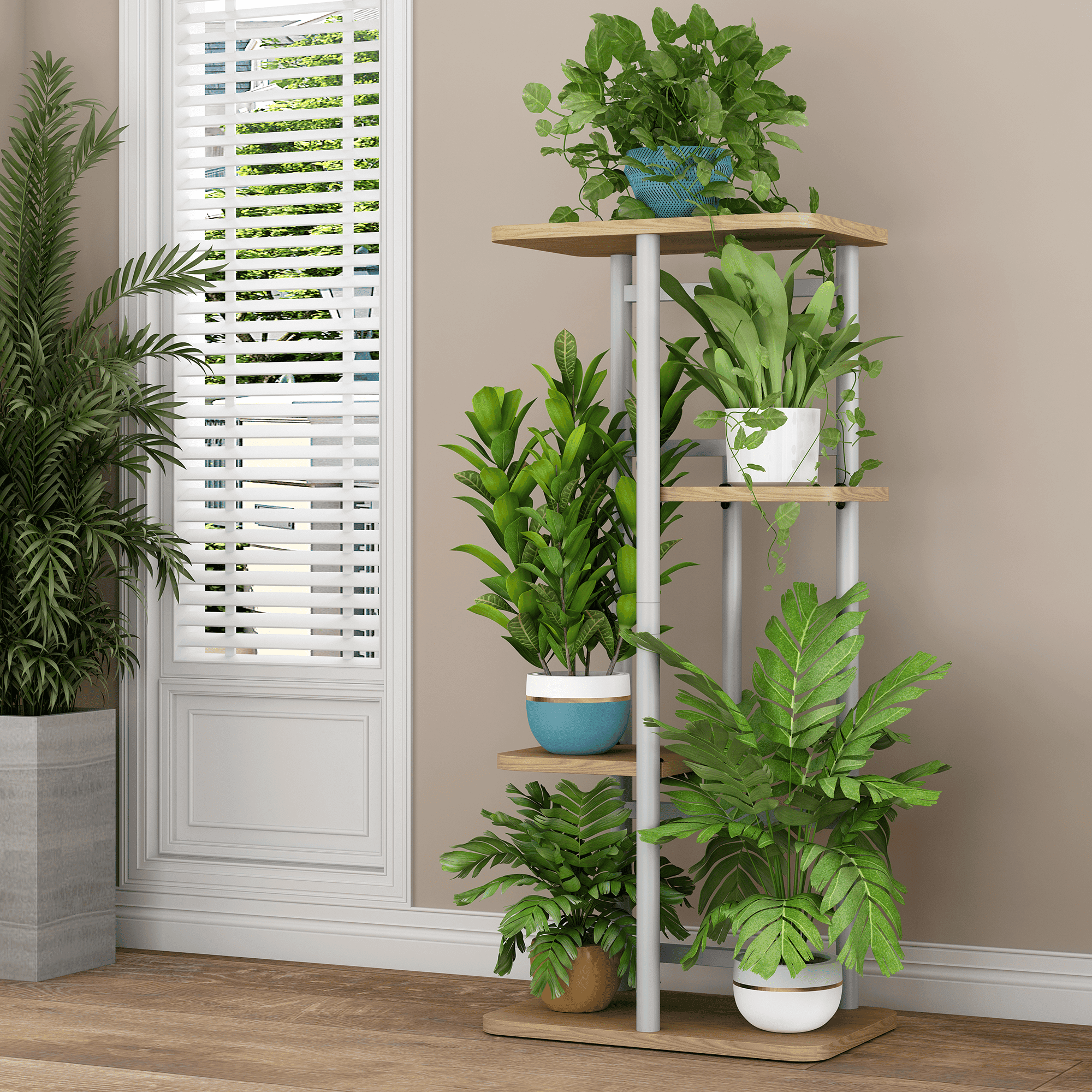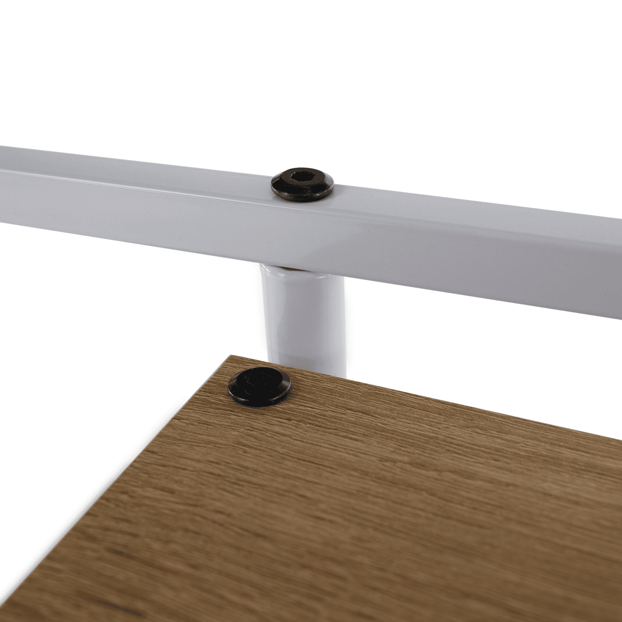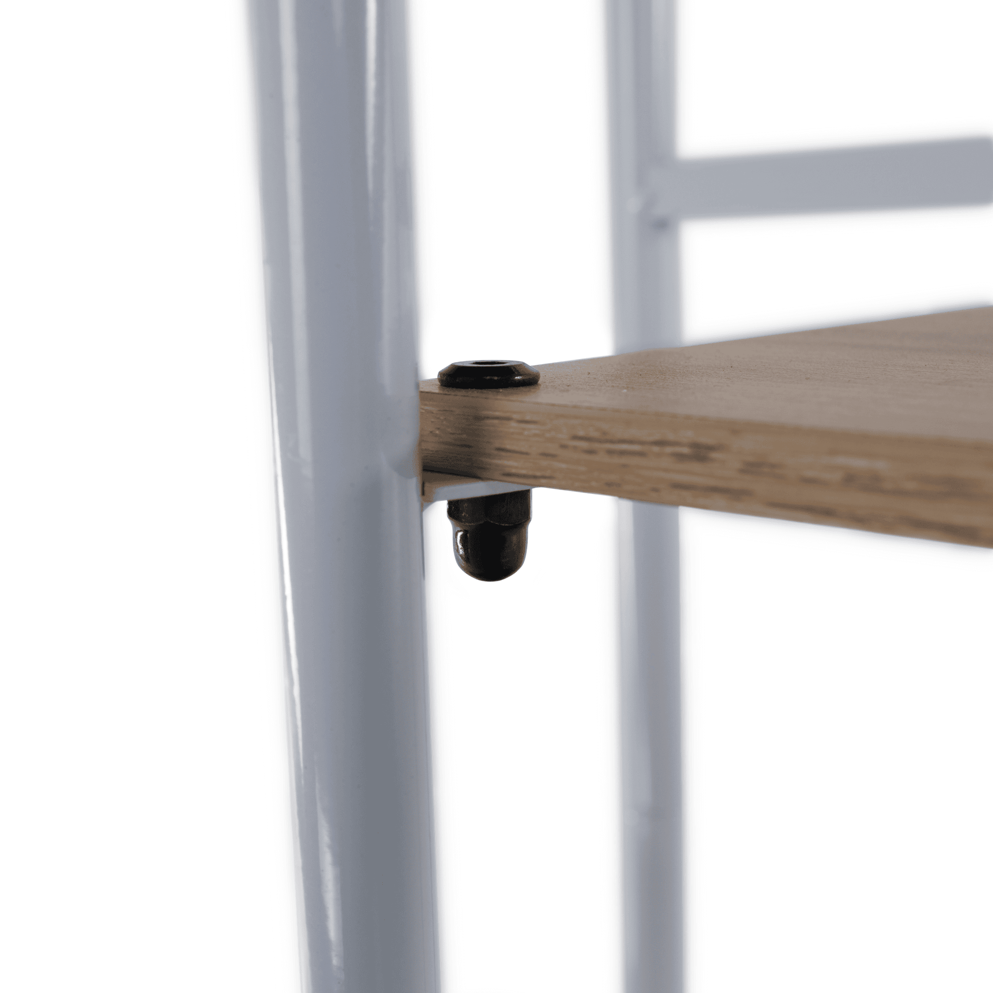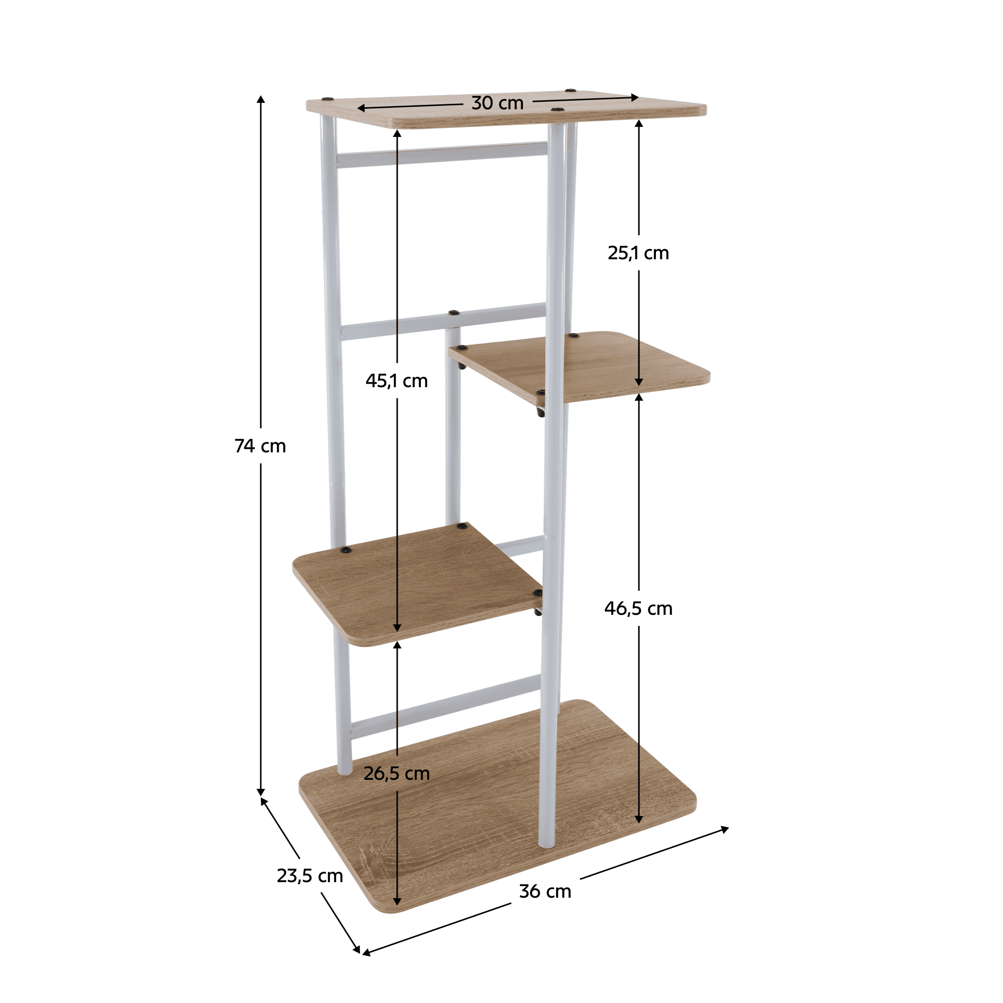 Material: metal/DTD Culoare: alb/stejar sonoma Dimensiuni (LxAxÎ): 36×23,5×74 cm Lăţimea raftului superior: 30 cm Înălţimea dintre primul şi al doilea raft din stânga: 26,5 cm Înălţime între al doilea şi al treilea raft din stânga: 45,1 cm Înălţime între primul şi al doilea raft din dreapta: 46,5 cm Înălţime între al doilea şi al treilea raft din dreapta: 25,1 cm Grosimea tijei: 1,6 cm Capacitate de încărcare pe raft: 2 kg Vă recomandăm o încărcare uniformă pe rafturi Ca suport pentru plante în ghiveci Practic Multifuncţional Design modern Furnizat în formă dezasamblată