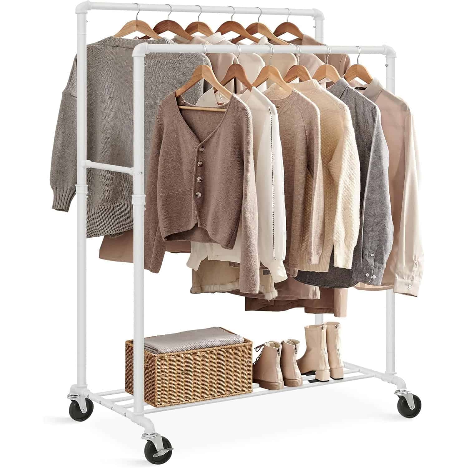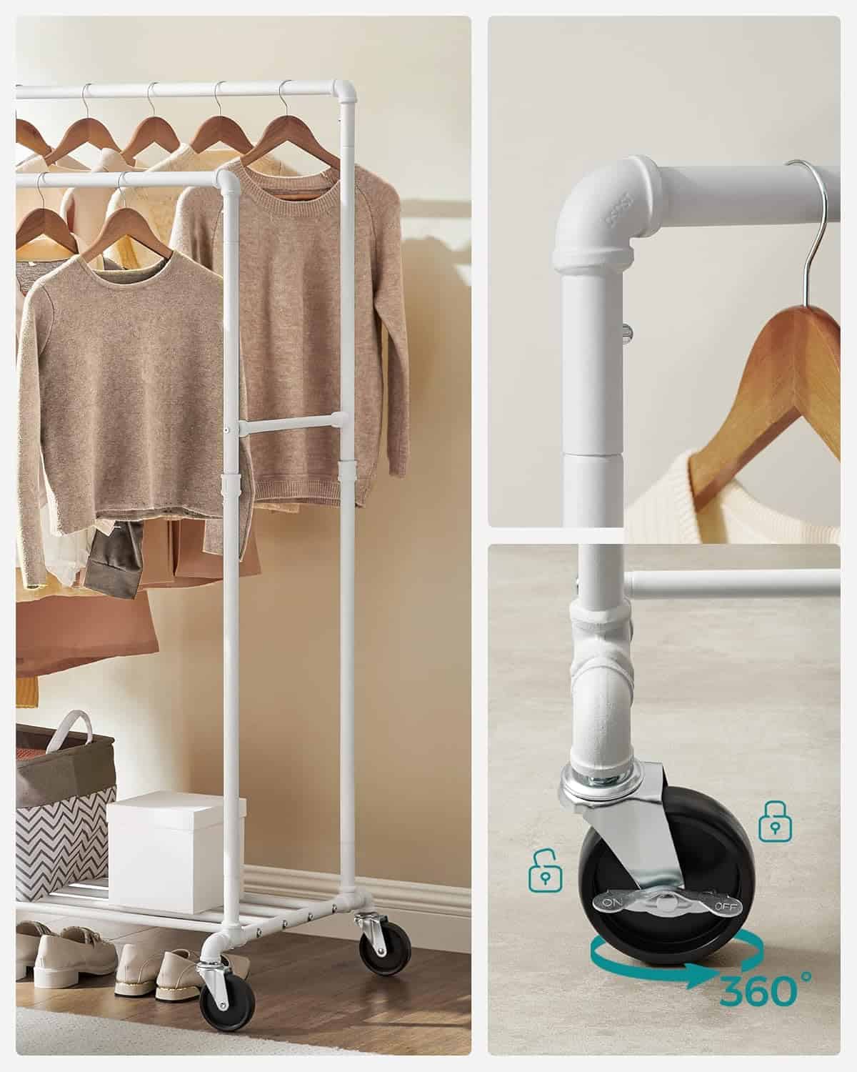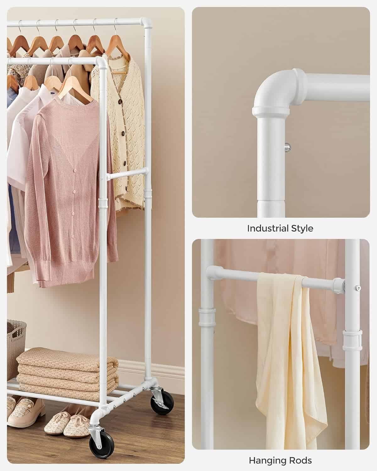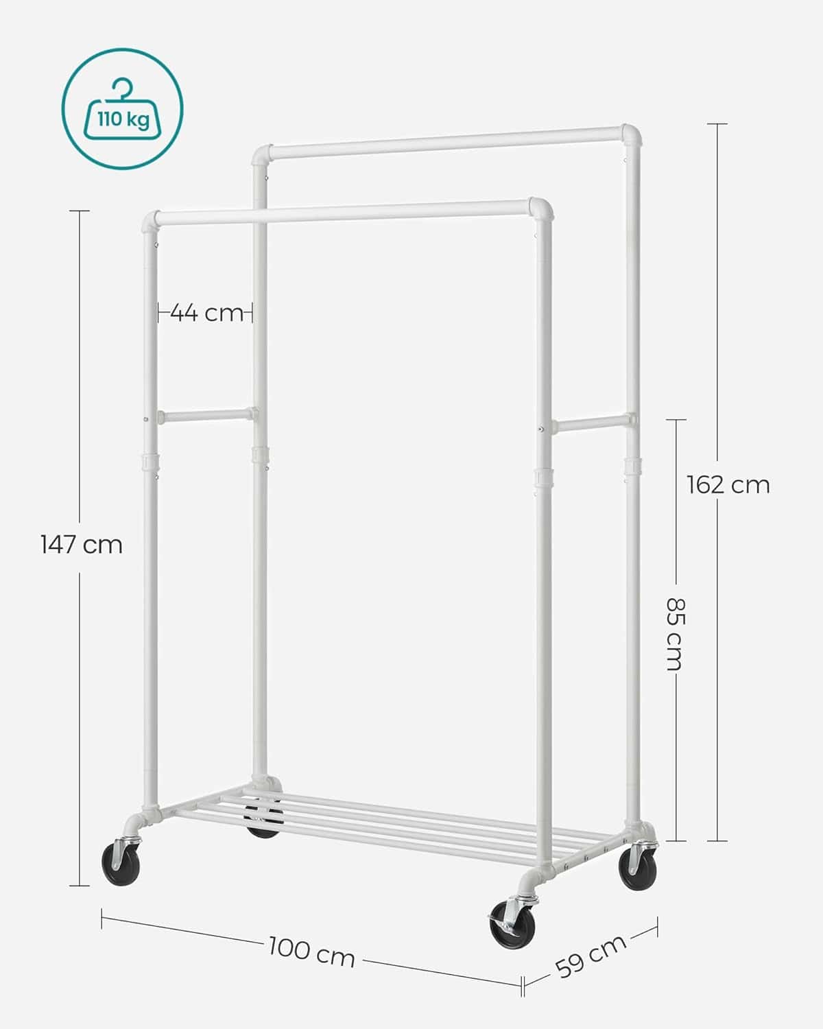Suport haine cu 2 bare si raft, cu roti, cadru metalic, design industrial, 100x59x162 cm, alb Mob360