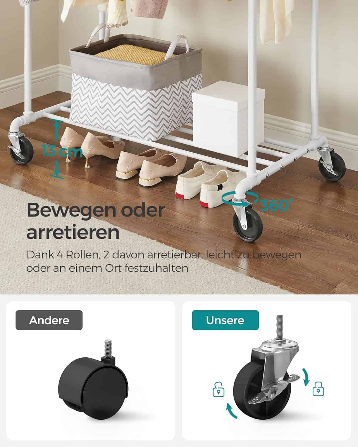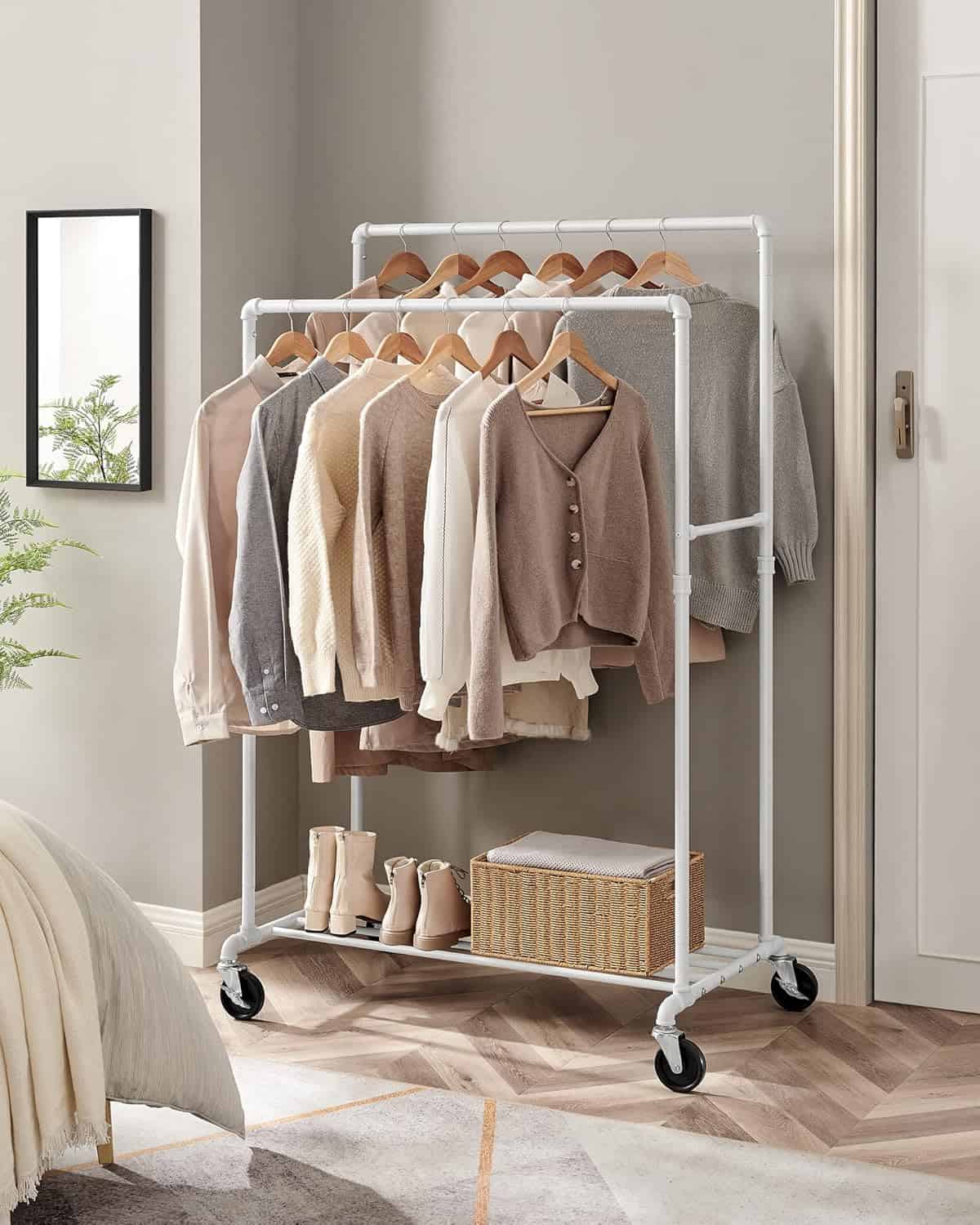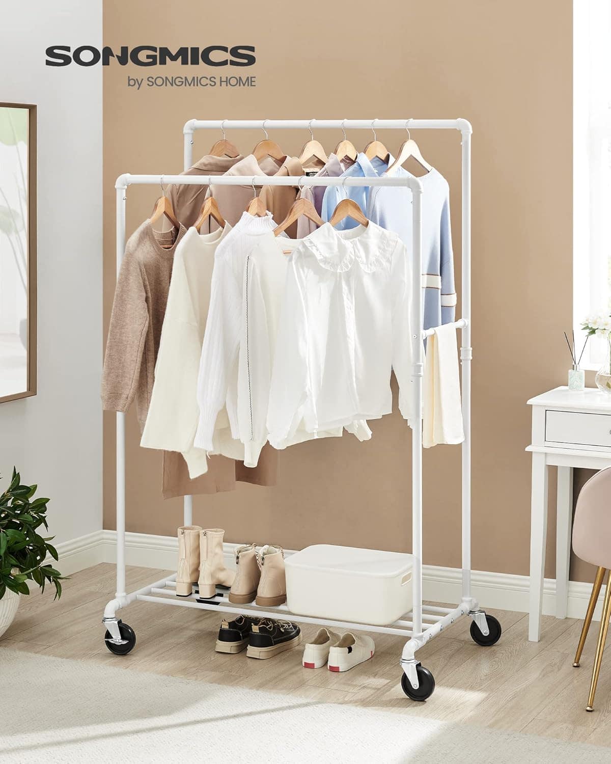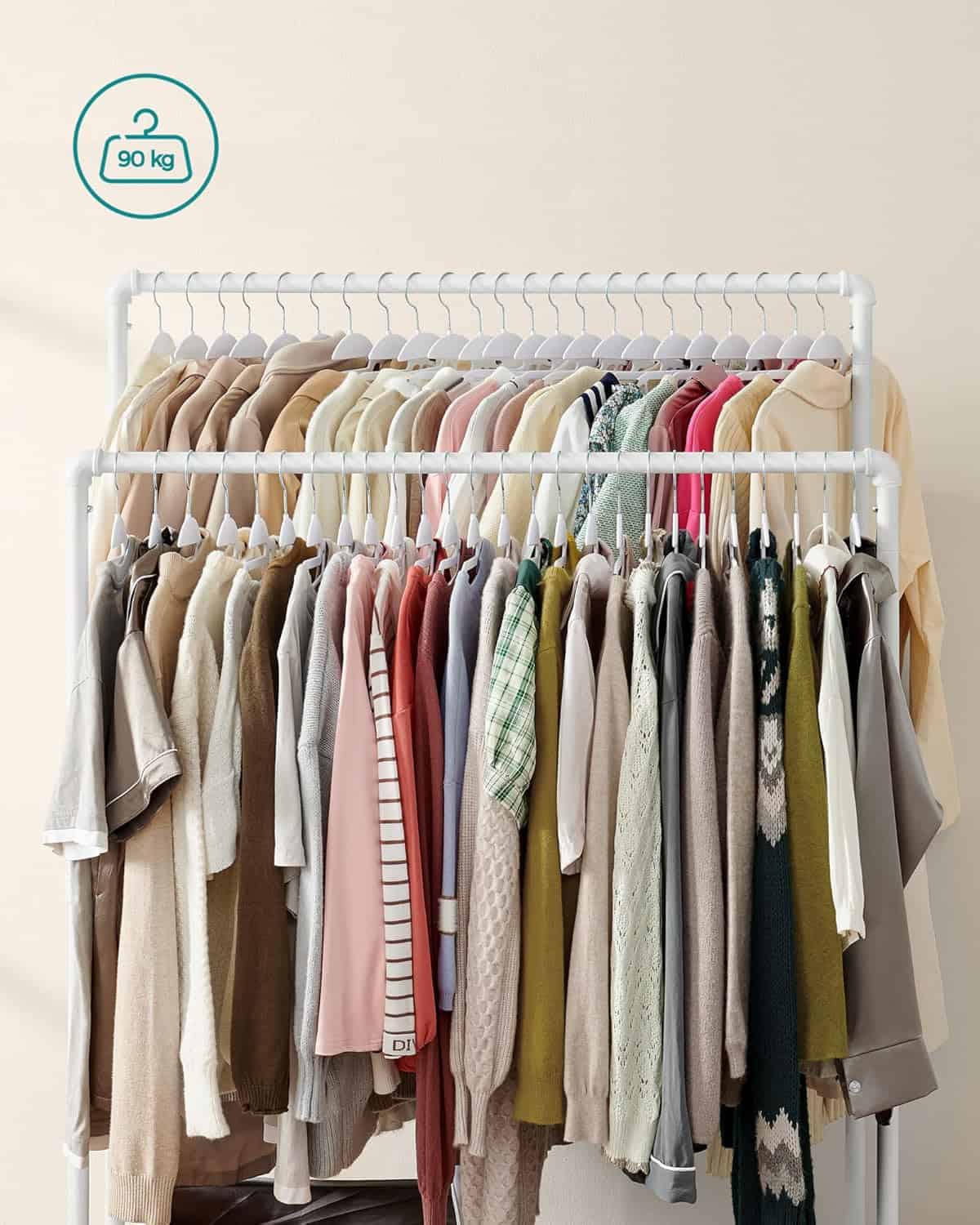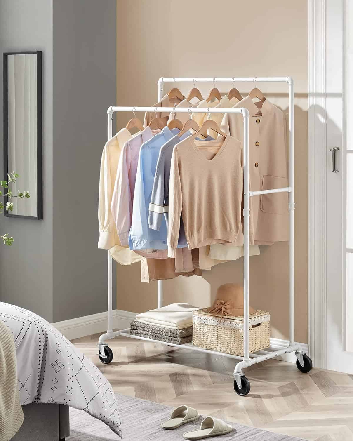 Suport haine cu 2 bare si raft, cu roti, cadru metalic, design industrial, 100x59x162 cm, alb Mob360