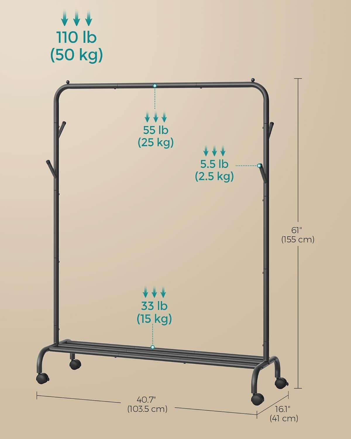 Specificatii tehnice Brand: SONGMICS Cod produs: HSR131B01 Culoare: negru Material: otel aliat Dimensiuni: 103.5 x 41 x 155 cm Capacitate maxima totala: 50 kg Capacitate bara haine: 25 kg Capacitate raft inferior: 15 kg Capacitate carlig: 2.5 kg Numar roti: 4 (2 cu frana) Diametru tevi: 22 mm Scurta descriere Suportul de haine SONGMICS este o solutie practica pentru organizarea eficienta a hainelor. Dispune de o bara inalta pentru articole de diferite lungimi, carlige laterale pentru accesorii si un raft inferior pentru cutii sau incaltaminte. Rotile permit deplasarea usoara intre incaperi. Caracteristici principale Bara inalta pentru haine scurte si lungi Carlige laterale pentru genti si accesorii Raft inferior pentru pantofi sau cutii Patru roti pivotante pentru mobilitate Doua roti cu sistem de blocare Structura solida din otel cu sustinere pana la 50 kg Ventilatie buna pentru uscare rapida a hainelor Montaj simplu cu instructiuni clare