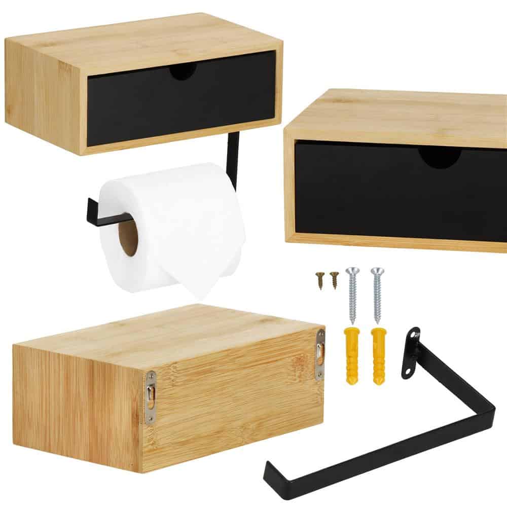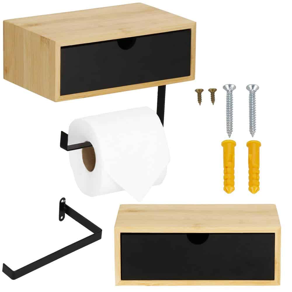 Suport hartie igienica din otel cu sertar depozitare, sistem montare inclus, 22cm, negru bej Mob360