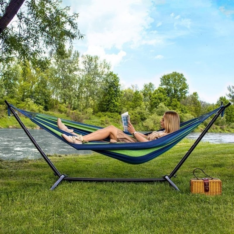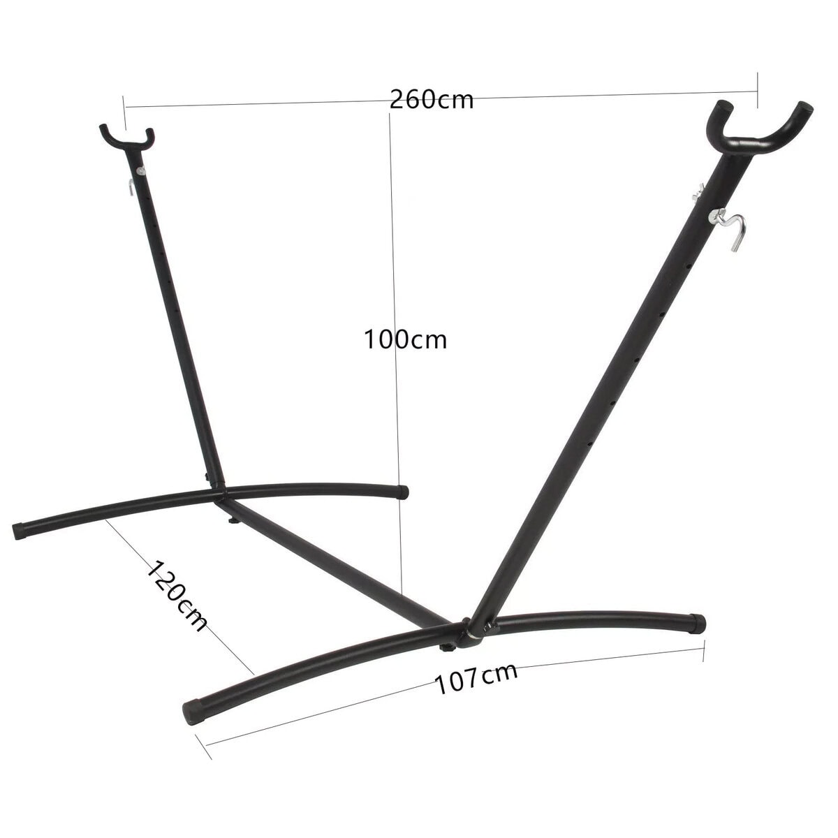 - Odihniti-va acasa in gradina, sau oriunde in aer liber. Suportul pentru hamac puteti asambla oriunde doriti. Dupa asamblare nu aveti alta treaba decat sa agatati hamacul pe suport si sa va relaxati. Nu trebuie sa-l folositi neaparat in aer liber, si o camera mai mare sau o terasa poate fi locul perfect. Este conceput din otel, arata bine in orice mediu, incapere. In pachet veti gasi toate suruburile necesare, asamblarea este usoara. In pachet veti gasi si doua carlige, cu ajutorul acestora puteti fixa hamacul de suport.Distanta dintre cele doua capete poate fi reglat la 6 nivele. Capacitate de incarcare: 150 kg