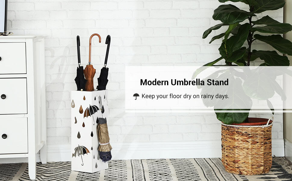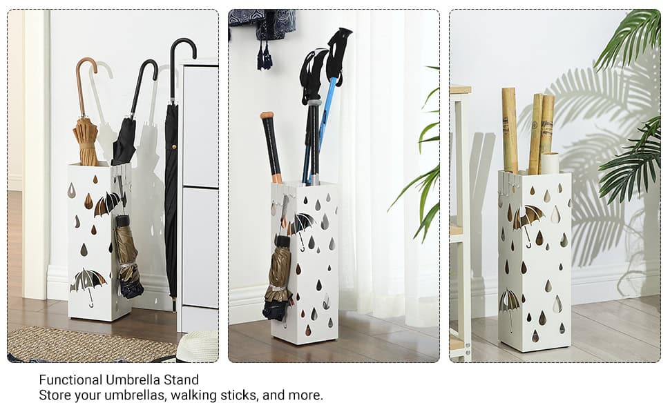 Specificatii: Material: Metal Dimensiuni: 15,5 x 15,5 x 15,5 x 49 cm (L x l x a) Culoare: Alb Greutate neta: 2 kg Despre acest articol Mai mult decat un simplu loc pentru a va organiza si usca umbrelele in zilele ploioase, acest suport de umbrele cu decupaje cu tematica de ploaie confera un aspect artistic pentru o intrare mai primitoare.Nu lasati picaturile de ploaie de la umbrele sa va strice podeaua si dragostea pentru zilele ploioase; opriti-le cu ajutorul tavii de scurgere din acest suport pentru umbrele si apoi bucurati-va de zi – intindeti-va cu o carte sau nu faceti nimic altceva decat sa ascultati ploaia.Acest suport de 15,5 x 15,5 x 49 cm ofera suficient spatiu pentru umbrelele dvs. lungi. Dar asta este doar o parte din el! Cele 4 carlige incluse (2 lungi si 2 scurte) va permit, de asemenea, sa agatati umbrelele dvs. mici pliabile, astfel incat sa nu se adune in partea de jos.Acest suport de umbrele din metal de calitate asigura un nivel ridicat de stabilitate, chiar daca puneti inauntru mai multe umbrele lungi, role de hartie, bastoane sau alte obiecte.