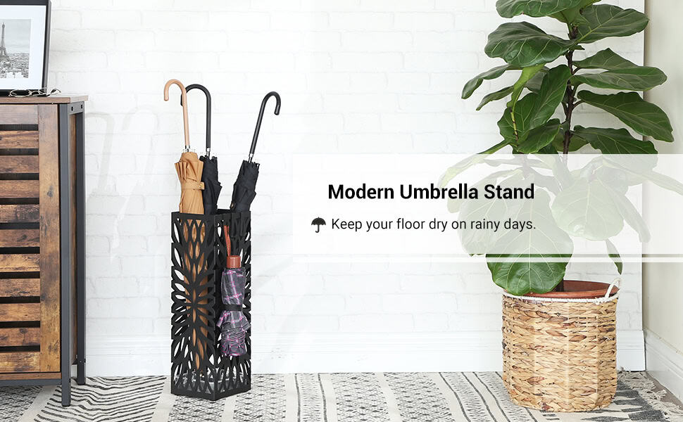 Mai mult decat un simplu loc pentru a va organiza si usca umbrelele in zilele ploioase, acest suport de umbrele cu decupaje cu tematica de ploaie confera un aspect artistic pentru o intrare mai primitoare.Nu lasati picaturile de ploaie de la umbrele sa va strice podeaua si dragostea pentru zilele ploioase; opriti-le cu ajutorul tavii de scurgere din acest suport pentru umbrele si apoi bucurati-va de zi – intindeti-va cu o carte sau nu faceti nimic altceva decat sa ascultati ploaia.Acest suport de 15.5 x 15.5 x 49 cm ofera suficient spatiu pentru umbrelele dvs.