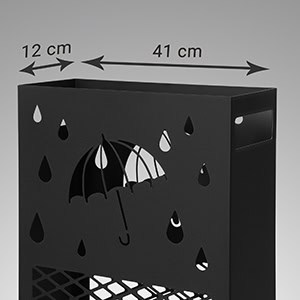 Detalii produs: Culoare: Negru Material: Otel Dimensiuni: 28 x 12 x 41 cm (L x l x i). Greutate: 1,9 kg. Despre acest articol Acest produs este mult mai mult decat un suport pentru umbrele care creeaza ordine in zilele ploioase! Designul decupat adauga, de asemenea, o nota speciala holului dvs. si asigura uscarea rapida a umbrelelor ude. Fabricat din otel de inalta calitate, suportul pentru umbrele este intotdeauna stabil, chiar si atunci cand este incarcat complet. De asemenea, suportul solid promite o durata lunga de viata.Suportul nostru are o tava pentru a colecta apa care picura de la umbrele. Astfel, casa dvs. ramane frumoasa si uscata chiar si in zilele ploioase.Umbrele de ploaie, bete de drumetie, role de hartie cadou: umbrele mari, umbrele pliabile mici – acest suport inalt de 41 cm cu 4 carlige este foarte potrivit pentru acest lucru! Doriti sa depozitati bete de drumetie sau role de hartie de impachetat? Nici aceasta nu este o problema!Ce primiti: un suport metalic pentru umbrele, care este echipat cu o tava de picurare detasabila, 4 carlige si 4 tampoane pentru picioare pentru a va proteja podeaua de zgarieturi.