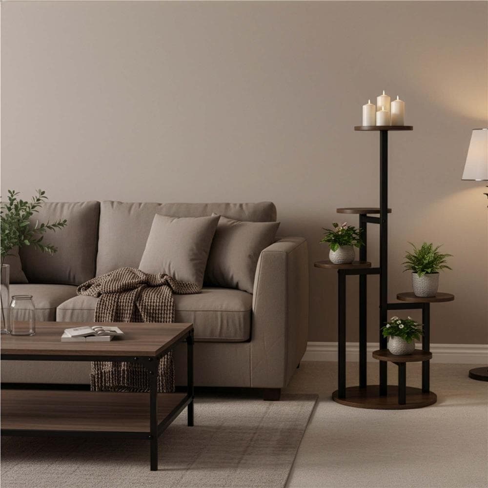 - Suport decorativ pentru plante cu 5 polite rotunde din lemn si structura metalica stabila. Designul vertical permite expunerea plantelor in mod organizat, economisind spatiu. Potrivit pentru interior sau spatii acoperite. Caracteristici principale: