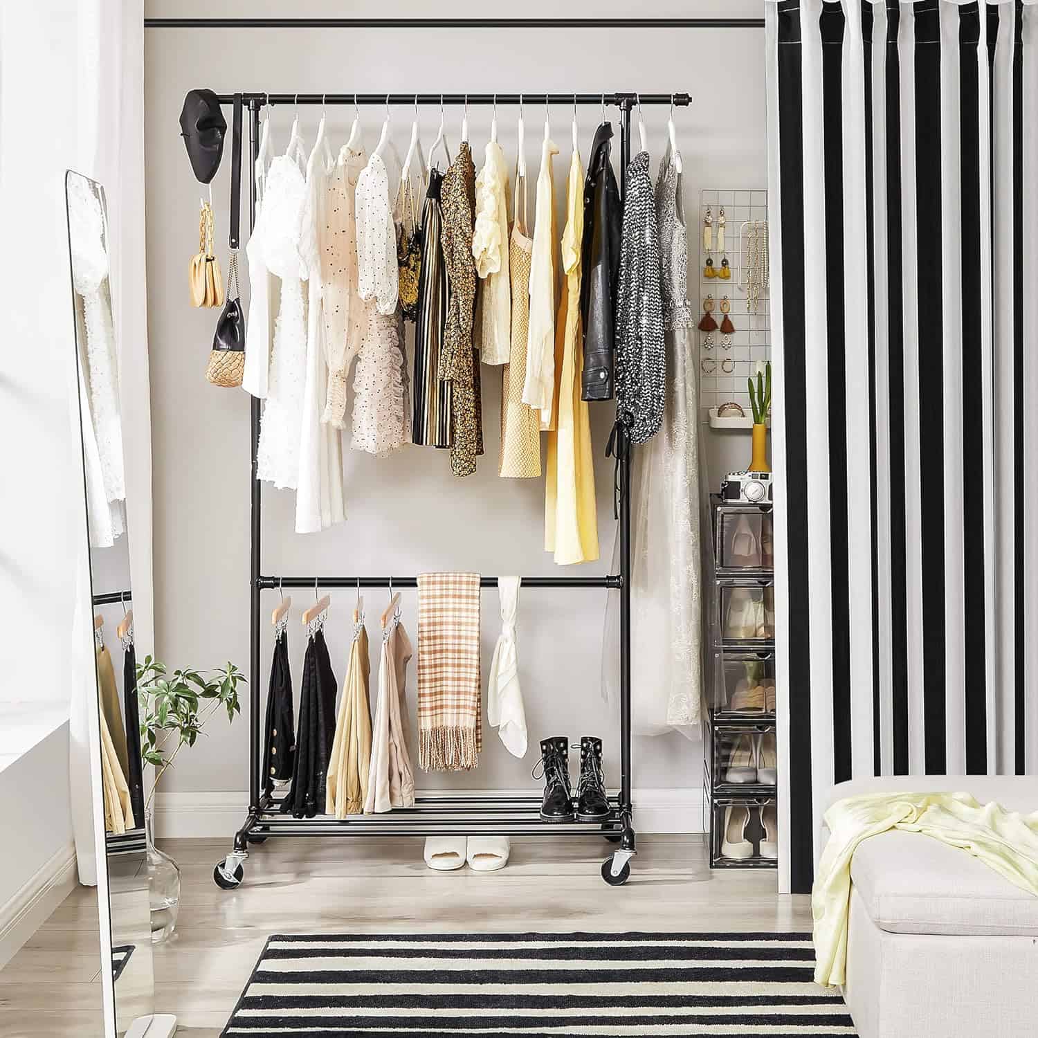 Specificatii: Culoare: Negru Material: Tub de otel acoperit cu pulbere Dimensiune produs: 130 x 49 x 198 cm (L x l x H) Greutate produs: 7,4 kg Max. Capacitate de incarcare: 110 kg Despre acest articol Stil industrial sic: Indiferent daca aveti un apartament rustic rece sau o casa feminina, acest suport de haine la moda de inspiratie industriala va fi o piesa de exceptie, afisand, de asemenea, imbracamintea elegant in buticuri sau pietele secundare. Stable si puternice: Tuburile metalice premium asigura stabilitate si rezistenta superioara cu o capacitate totala de greutate de 110 kg; pentru a-ti agata cele mai grele jachete de iarna sau rochii sic de cocktail, acest suport de imbracaminte este un must-have. Reglabil si spatios: Reglati sina din mijloc intre 4 inaltimi diferite (in timp ce inaltimea totala ramane fixa), agatati paltoanele sau rochiile lungi pe sina de sus si pantofii sau gentile gata pe raftul de jos – acest suport pastreaza totul intr-un singur loc. Usor de mutat sau de sedere: 4 roti universale din PP cu 2 frane de blocare asigura ca suportul pentru haine poate calatori fara probleme dintr-o locatie in alta si ramane pe loc. Asamblarea este usoara: Cu instrumente de asamblare, piese numerotate si instructiuni ilustrate, puteti configura cu usurinta aceasta sina pentru haine.