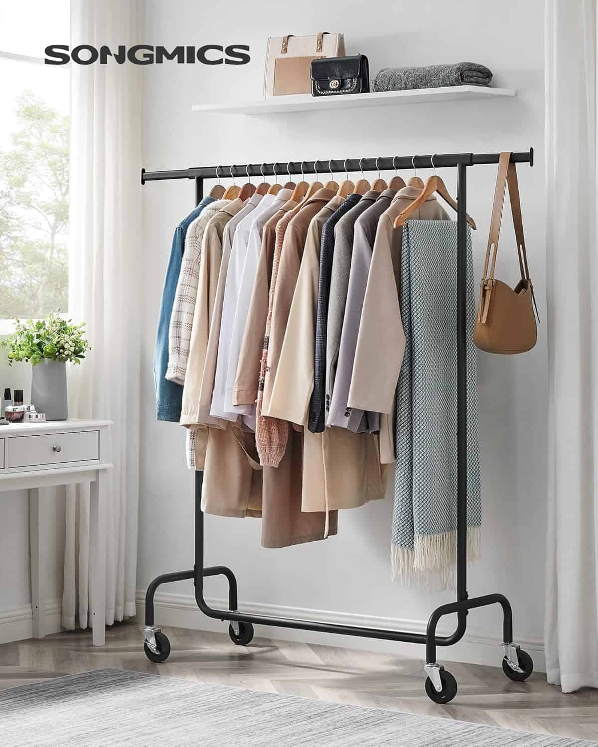 - Suportul pentru haine SONGMICS este o solutie practica si rezistenta pentru organizarea hainelor in dormitor, dressing sau spalatorie. Bara extensibila permite ajustarea lungimii pentru mai mult spatiu de agatare, iar structura din metal gros ofera stabilitate si sustine pana la 136 kg. Dotat cu 4 roti pivotante, dintre care 2 cu frana, suportul poate fi mutat usor si fixat in siguranta. Se monteaza rapid, fara unelte, si poate fi demontat pentru depozitare compacta. Caracteristici principale: