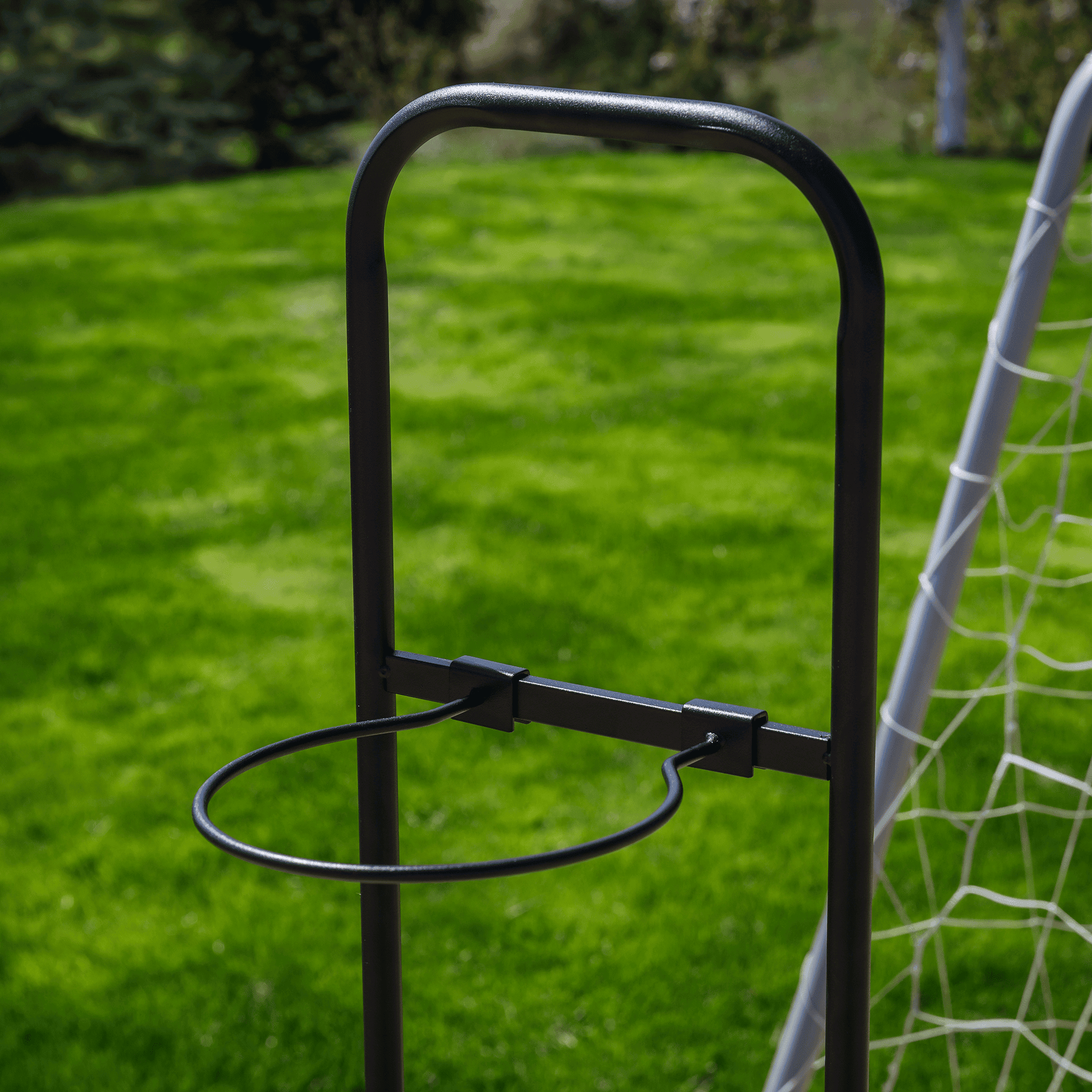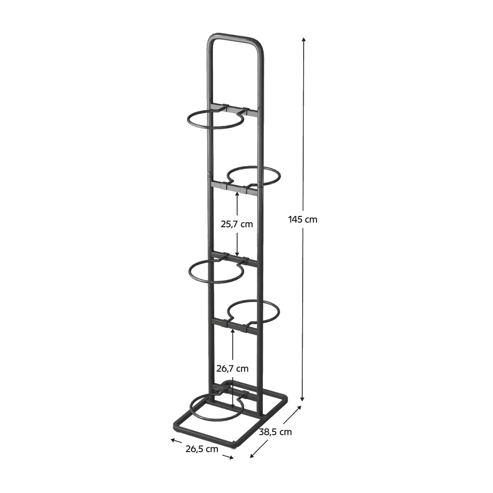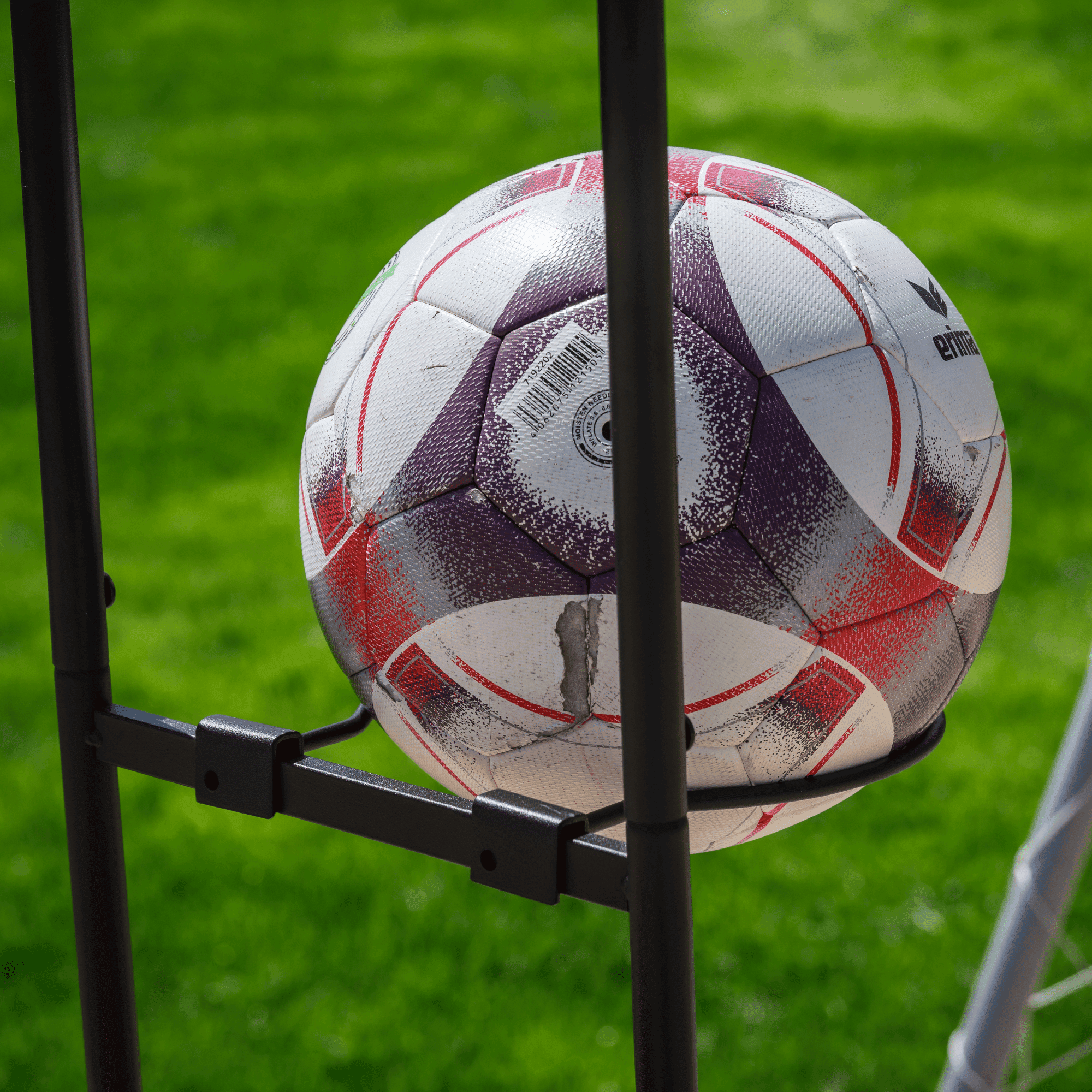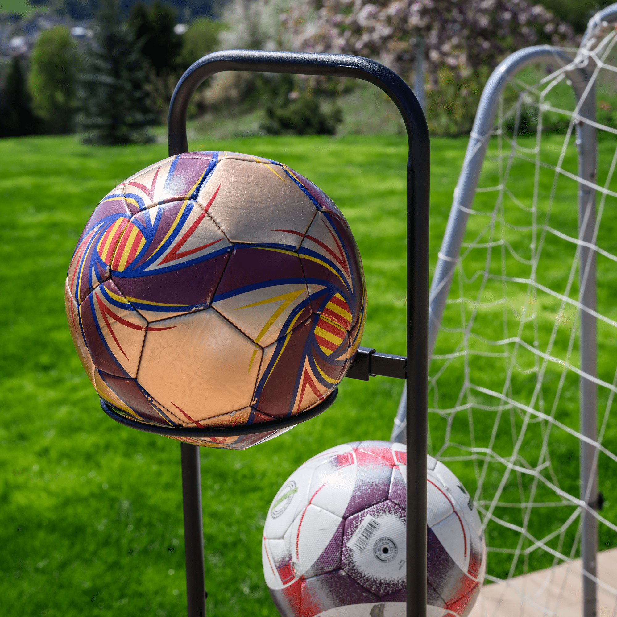 Material: metal Culoare: neagră Dimensiuni (Lxlh): 38,5×26,5×145 cm Grosime material: 1,6 kg Portanţă per poliţă: 2 kg Suport pentru mingi Capacitate: 5 bucăţi Suporturile pentru mingi sunt retractabile Posibilitatea de a amplasa suportul pe oricare dintre părţi Se livrează dezasamblate