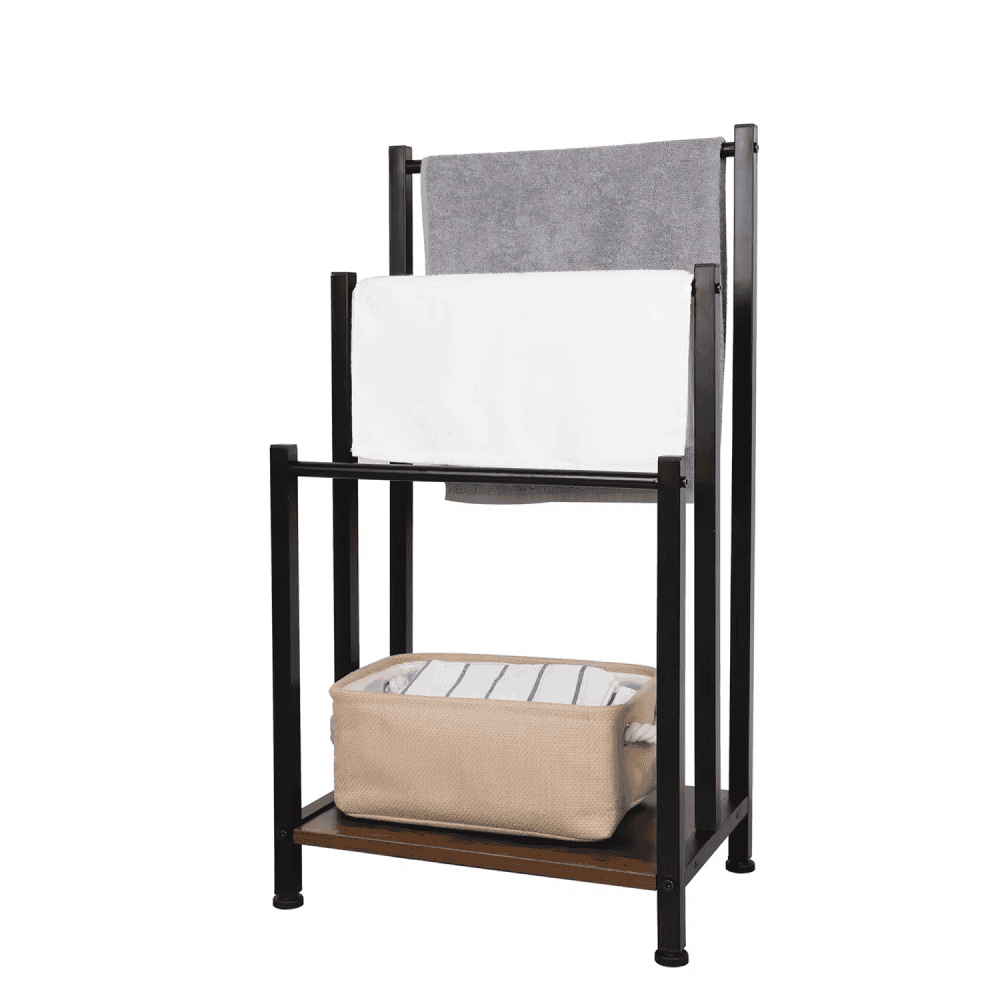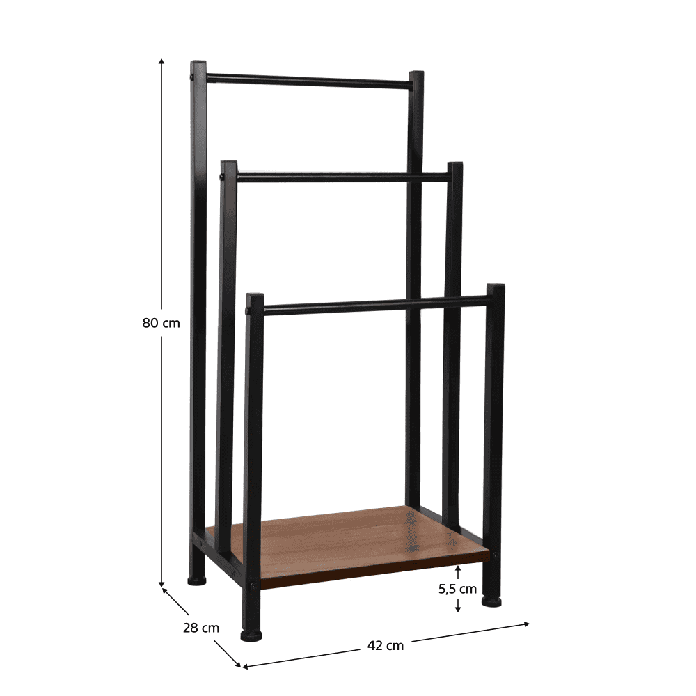 Material: metal / MDF Culoare: neagră / naturală Dimensiuni (LxAxÎ): 42x28x80 cm Trei rânduri Cu picioare Înălţime de la sol până la partea inferioară a raftului: 5,5 cm Pentru depozitarea prosoapelor Raft inferior de depozitare Capacitatea de încărcare a raftului inferior: 15 kg Livrat dezasamblat