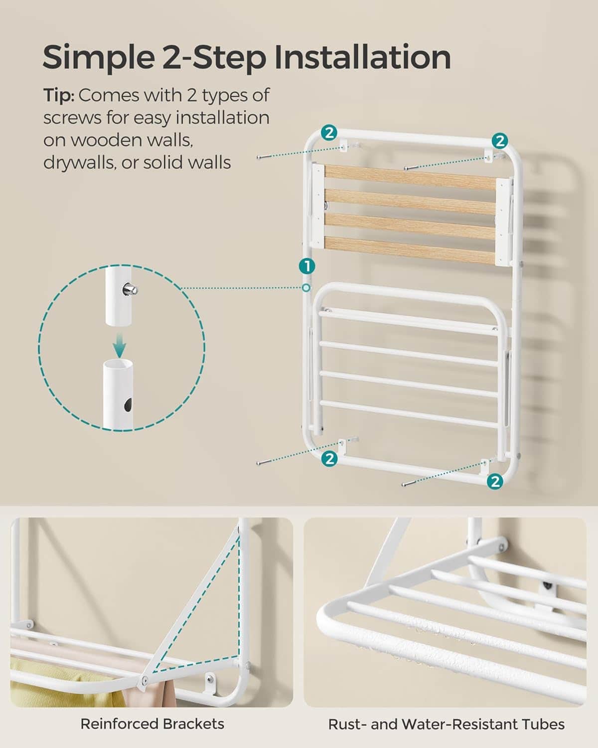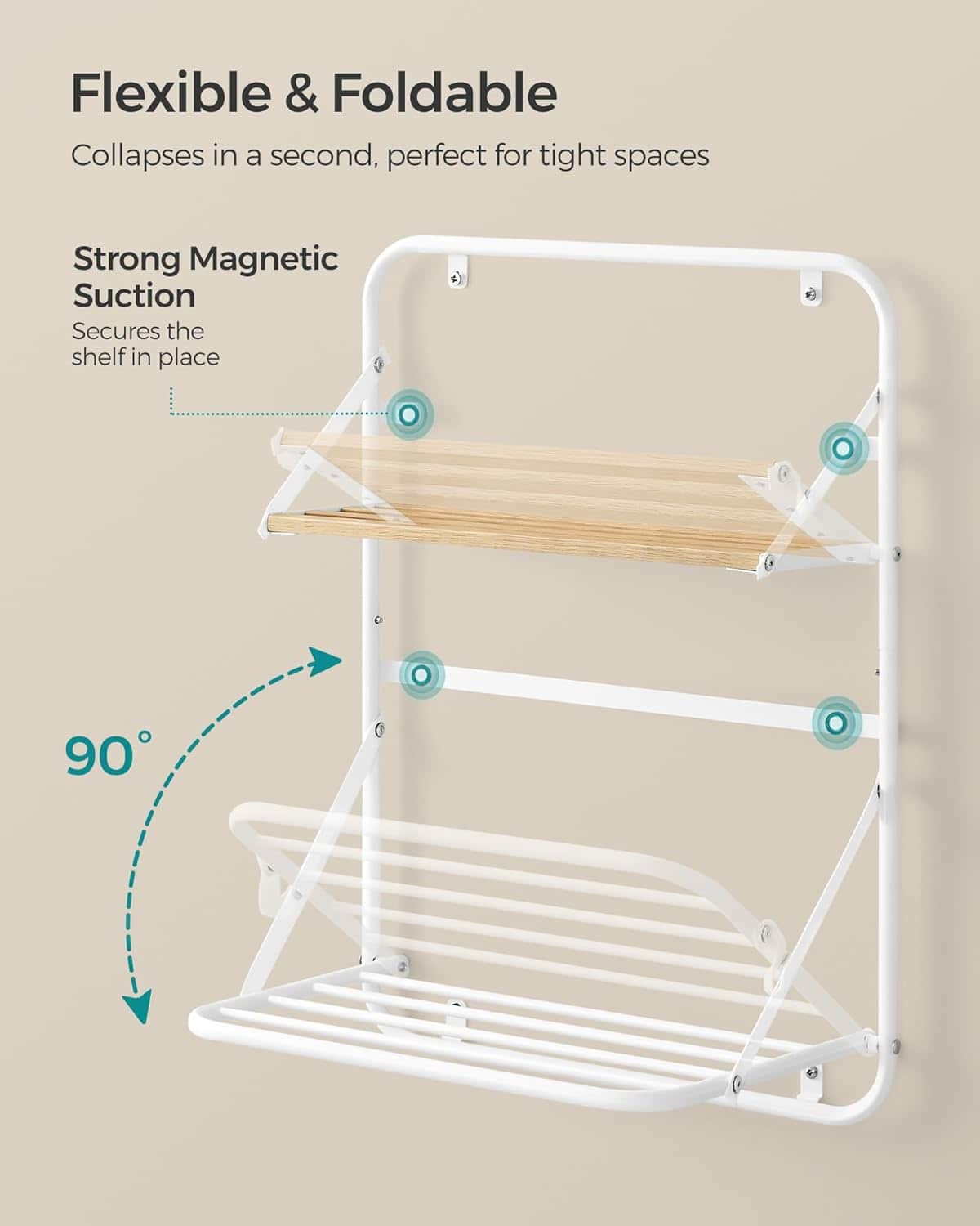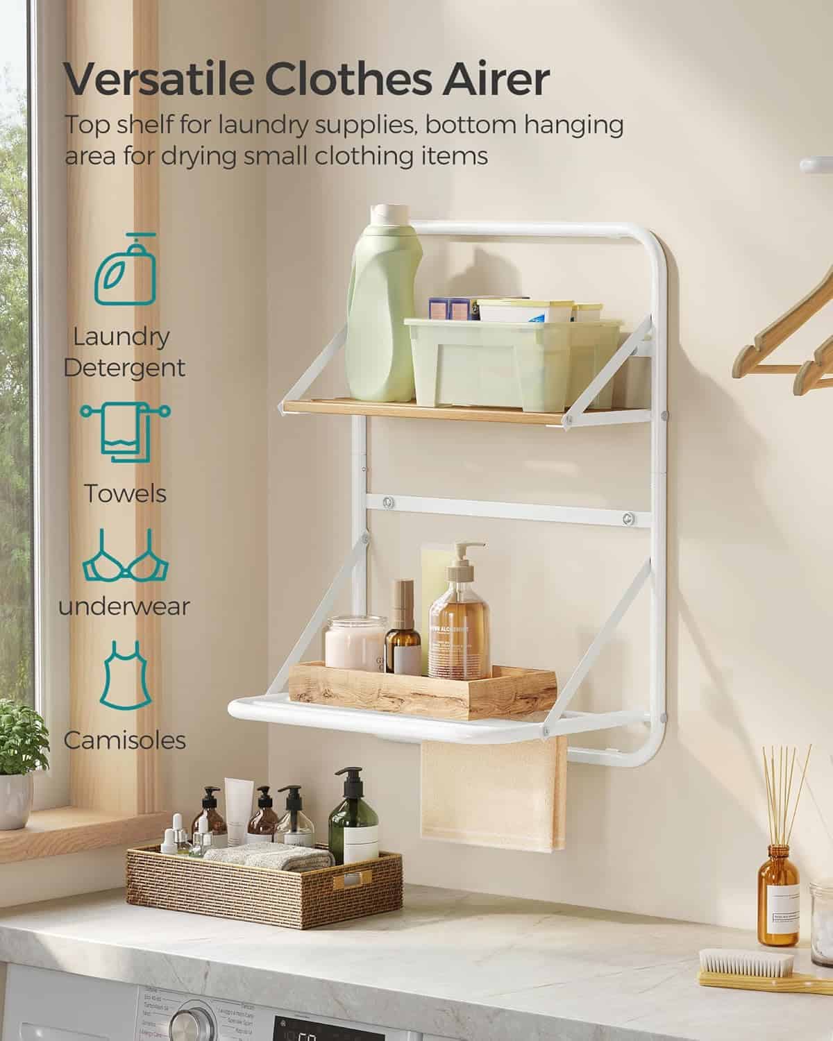 Specificatii tehnice Brand: SONGMICS Material: Otel carbon Culoare: Alb cloud Dimensiuni: 26x 38 x 56 cm (pliat 3 cm adancime) Greutate maxima suportata: pana la 10 kg Functii: Suport uscare cu 5 bare, polita de depozitare, tija pentru agatare, design magnetic Scurta descriere Suportul de rufe pliabil SONGMICS este solutia practica pentru spatii mici. Conceput pentru montaj pe perete, include 5 bare pentru uscarea rufelor, o polita pentru detergenti si tije pentru accesorii. Structura din otel carbon este rezistenta, iar designul magnetic permite plierea rapida si economisirea spatiului atunci cand nu este folosit. Caracteristici principale Design pliabil cu sistem magnetic pentru economie de spatiu 5 bare pentru uscarea rufelor si accesoriilor Polita practica pentru detergenti sau cosmetice Constructie solida din otel carbon rezistent Suporta pana la 10 kg Montaj simplu cu piese marcate si instructiuni clare Ideal pentru baie, bucatarie sau spatii mici