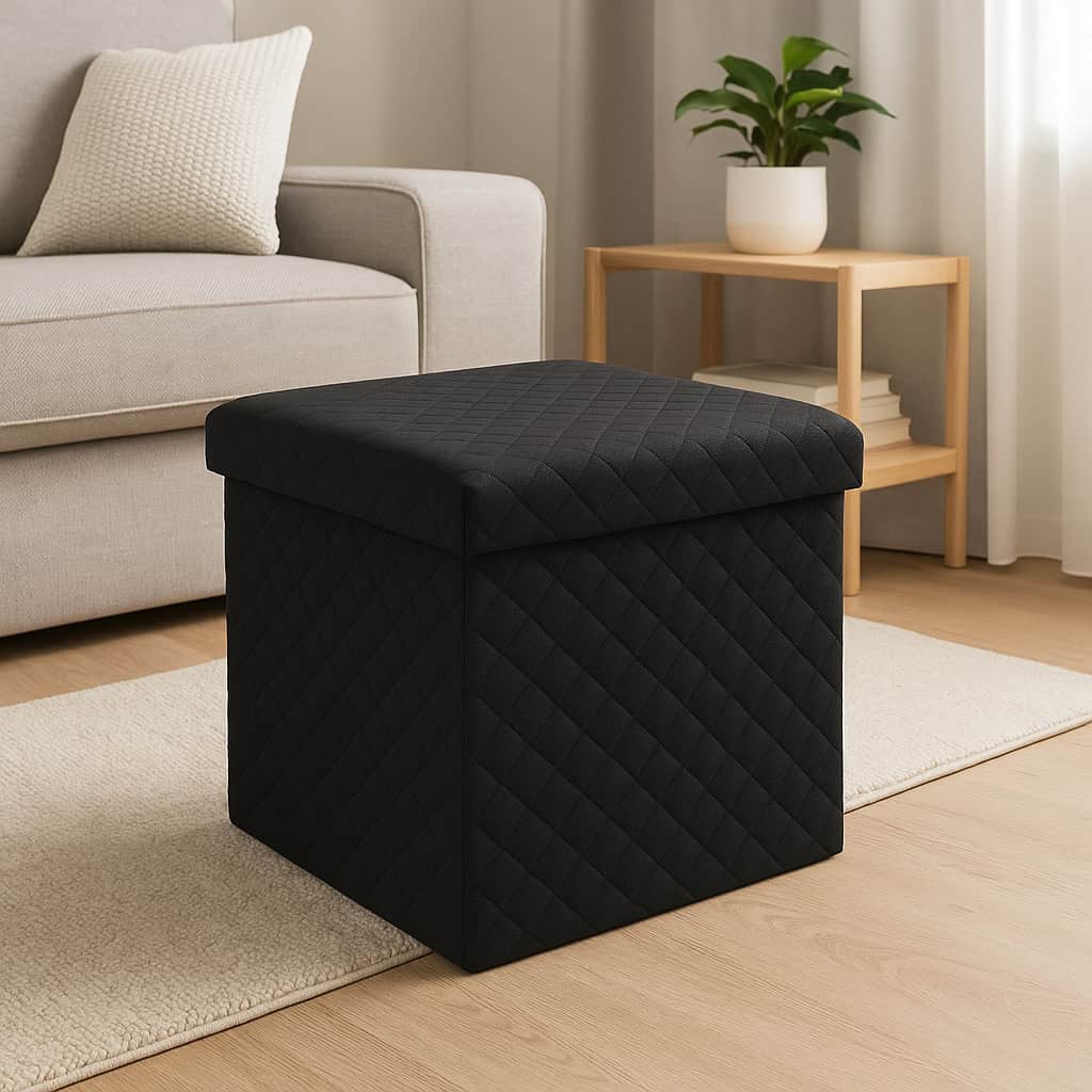 - Acest pouf pliabil este realizat din poliester negru si MDF E1, oferind un design compact si versatil. Ideal pentru a adauga un element decorativ in orice incapere, se potriveste perfect in spatii mici. Usor de asamblat, poate fi folosit atat ca obiect decorativ, cat si ca spatiu de depozitare suplimentar. Caracteristici principale: