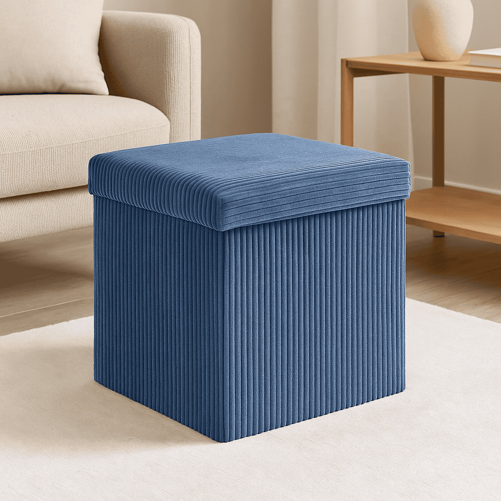Taburet pliabil Atmosphera Arum din material tip catifea raiat, 38x38x38 cm, albastru inchis Mob360 – produs disponibil în magazinul Mob360.