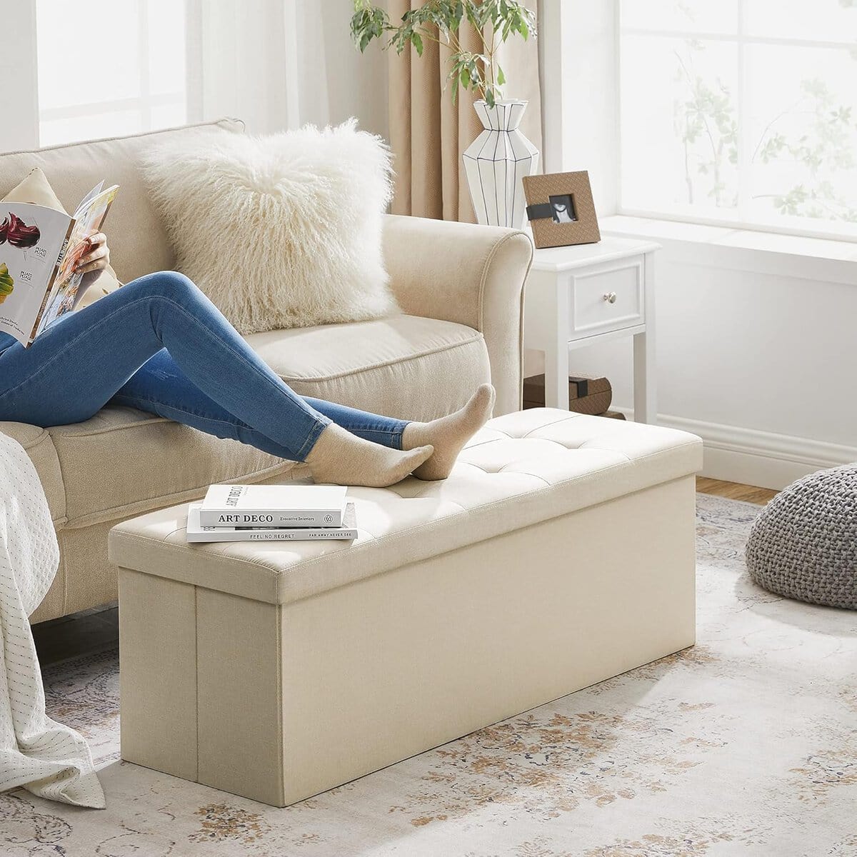 Taburet pliabil cu sezut moale, spatiu de depozitare 131litri, maxim 300kg, 110x38x38cm, crem Mob360