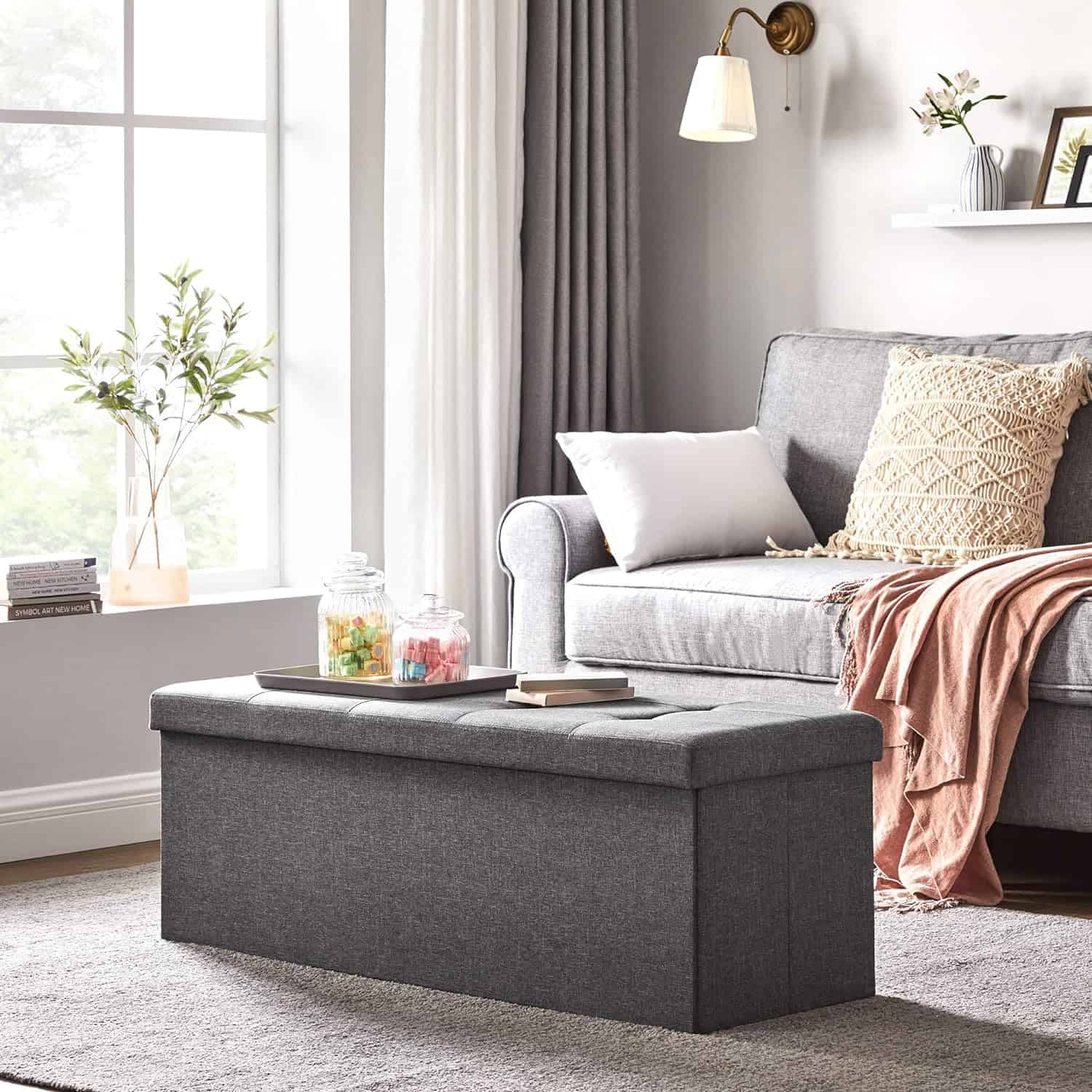 Elegant si solid: Acest pouf de depozitare are o tesatura eleganta cu aspect de in, cu cusaturi fine.