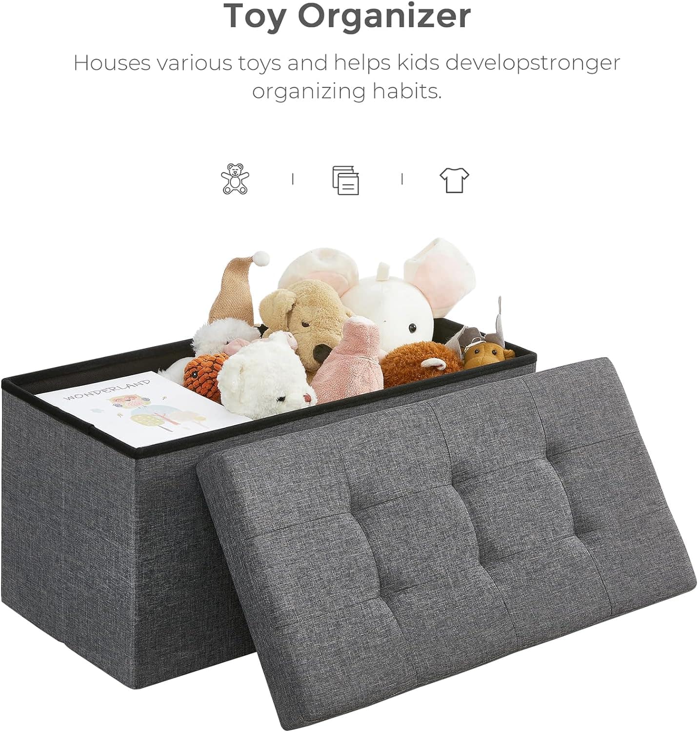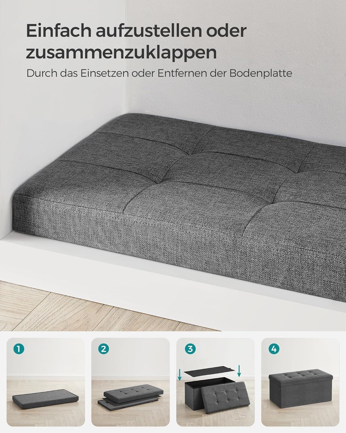 Taburet pliabil cu sezut moale, spatiu de depozitare 80litri, maxim 300kg, 76x38x38cm, gri inchis Mob360 – produs disponibil în magazinul Mob360.