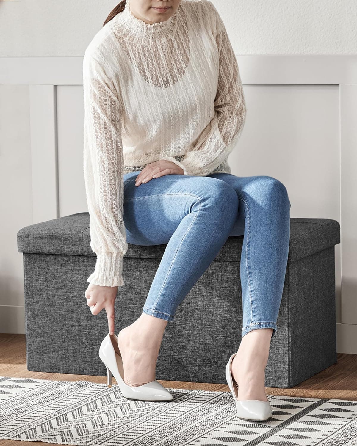 Taburet pliabil cu sezut moale, spatiu de depozitare 80litri, maxim 300kg, 76x38x38cm, gri inchis Mob360