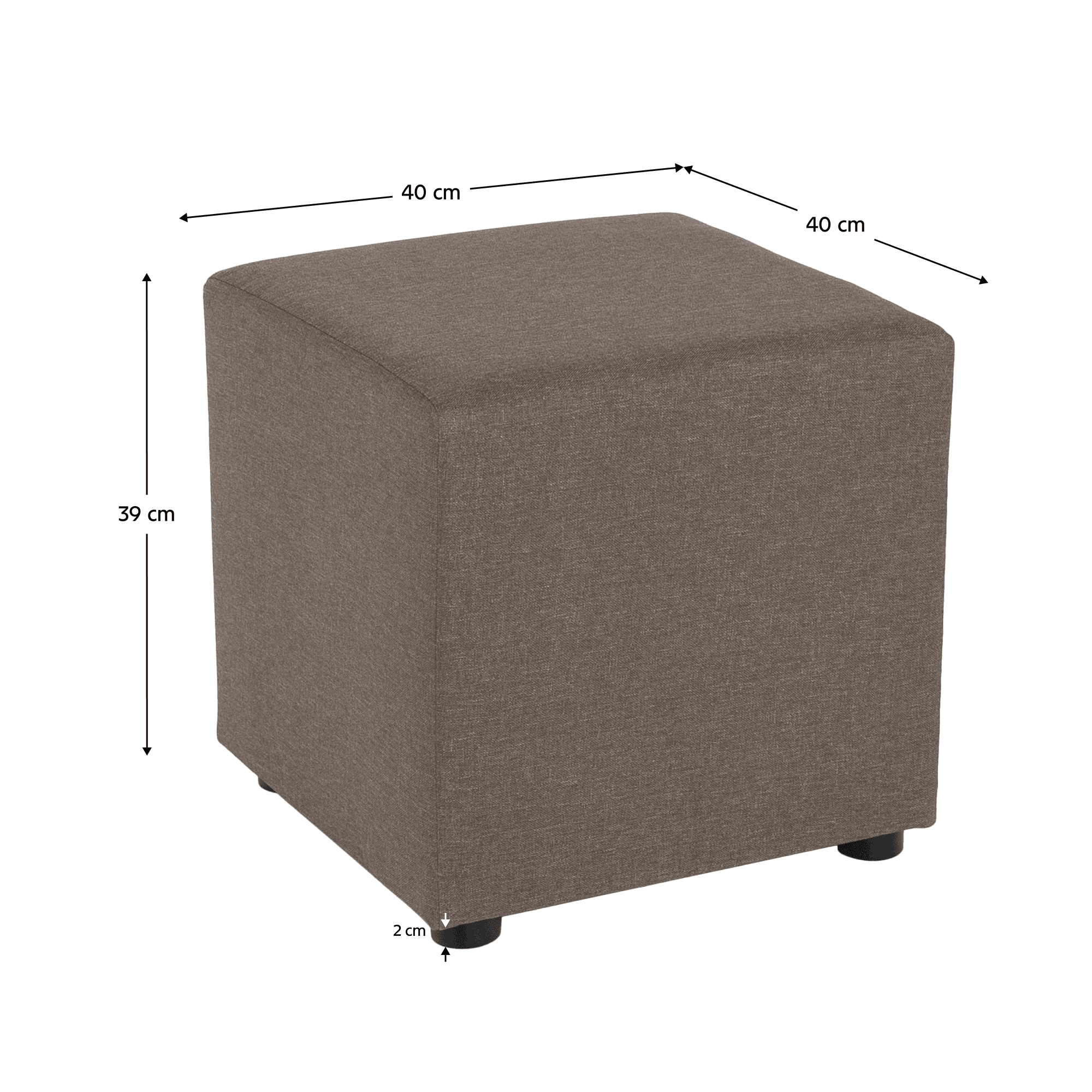 Material: ţesătură Savana 02 Versiune culoare: maro Rezistenţa la frecare a ţesăturii conform testului Martindale: 100.000 cicluri de frecare Miez taburet: PAL/spumă pur Dimensiuni (Lxlxh): 40x40x39 cm Înălţimea părţii de şezut: 39 cm Adâncimea părţii de şezut: 40 cm Portanţă: 100 kg Cu ??picioare de plastic Înălţimea picioarelor: 2 cm Greutate: 2 kg Livrat asamblat
